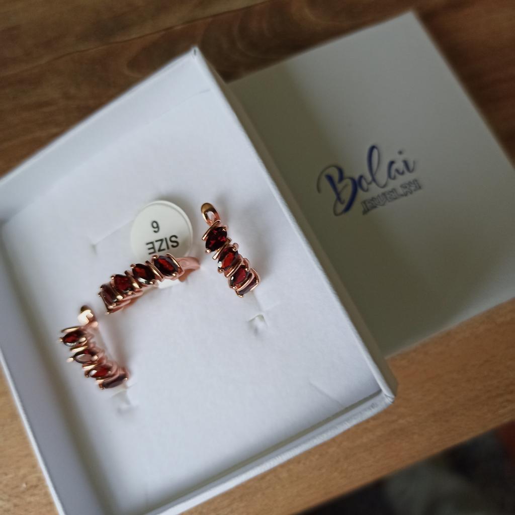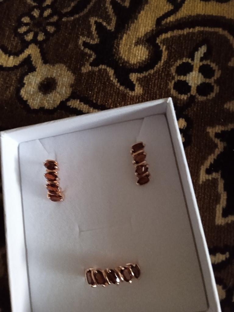 Комплект очень понравился, все камушки на месте. При освещении переливаются. Красный камень темного цвета, смотрится достойно. Спасибо.