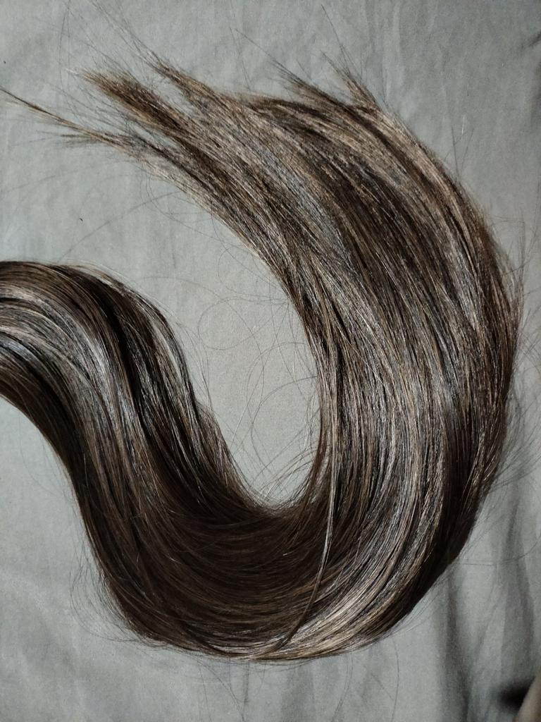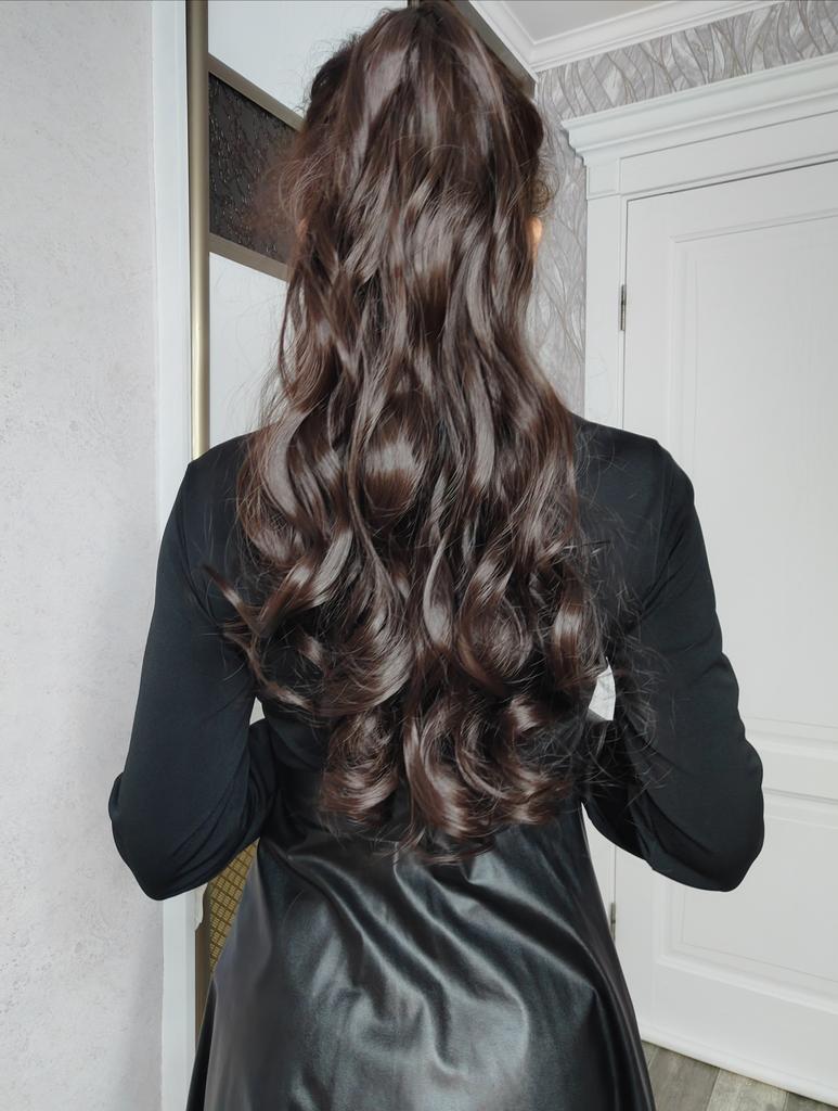 Хвост просто огонь! Я даже не ожидала. У меня когда-то лет 15 назад был такой, но качество волос- земля и небо. Этот хвостик мягкий, на ощупь точно как натур волосы, нет кукольного искусственного блеска, блестит, но в меру. Расчесала его, ничего не выпадает. Краб удобный, держится крепко. Не тяжёлый, мне комфортно. Под мои черные волосы цвет идеально подошёл. Девочки, заказывайте, не раздумывая. Классная вещь для смены образа