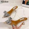 Eilyken Весенние серебряные женские туфли-лодочки с бантом и кристаллами, прозрачные сандалии из ПВХ на низком высоком каблуке, туфли для вечеринки, свадьбы, выпускного вечера