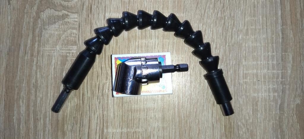 Брал как дешёвую замену угловой отвертке. Из хорошего - всё компактное, вал гнется более чем на 180 градусов. Теперь минусы. Думаю что в дрели эта конструкция долго не проживет. Всё трещит и болтается. Но это ещё не всё. Под стандарные биты и головки, это всё не подходит. Нужно или переделывать, или докупить 1/4 дюйма.