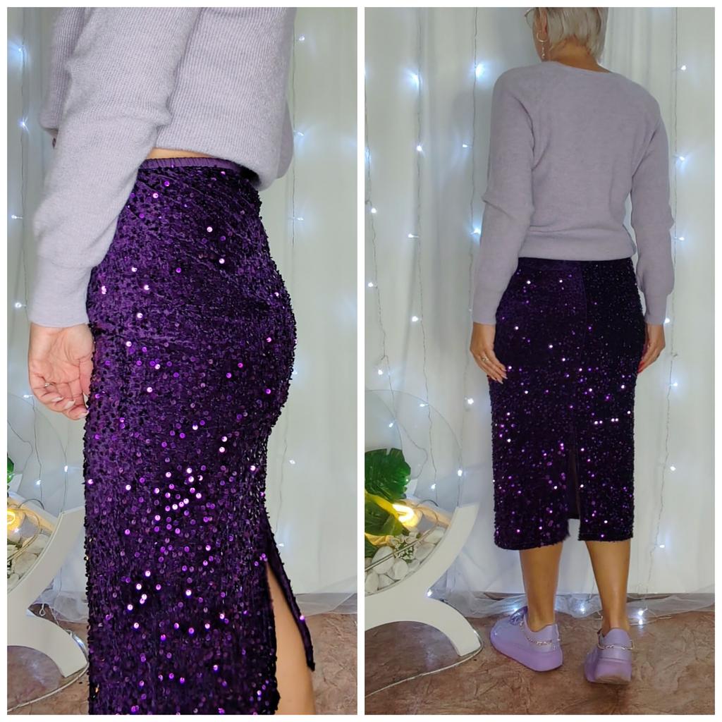 Юбка с пайтками апсолютный тренд сезона🔥 Привет! Я уже показывала Вам эту юбку с розовом цвете, пришло время показать Вам её в нассыщенном фиолетовом! Юбочка восторг! ‼️Добавила разговорное видео, там больше деталей ‼️ Ткань : Сшита юбка из двух видов ткани: Верхняя часть велюр он тянется, пайетки прям густо и щедро нашиты на неё. Внутри подкладка она НЕ тянется, пришита к шву на талии, короче самой юбки и относительно свободного кроя. Дизайн : Юбка - карандаш сзади не большой разрез. На талии резинка. Молний и пуговиц нет. Размер: На мне единый размер. Мои параметры : рост 172 см 98/76/106 см 📏Детали: Длина 80 см ОТ 64 до 108 см ОБ до 108 см Резюмирую : Юбка очень классная, хорошо вписывается в повседневные и даже спортивные образы. С ней интересно играть в игру "сам себе стилист". Я буду однозначно рекомендовать 💯 Я не прощаюсь, M_K #фиолетовый_свет