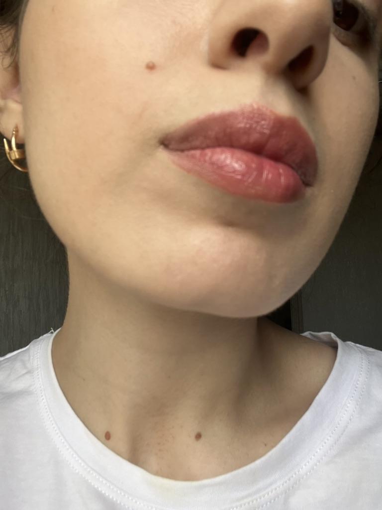 Цвет очень красивый и яркий, текстура приятная, но много нюансов. Вкус у тинта какой-то горький неприятно, он не очень стойкий, но главная проблема, что у меня течет флакон. Он как-то не герметично собран и тинт просто протекает на горлышке, пачкает все вокруг, взять его с собой невозможно, храню дома в вертикальном положении. На фото видно, что горлышко все испачкано, это как раз вытекший тинт.
