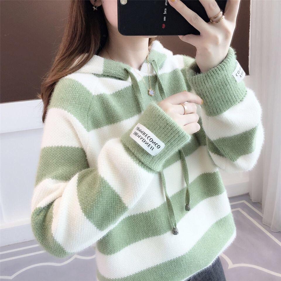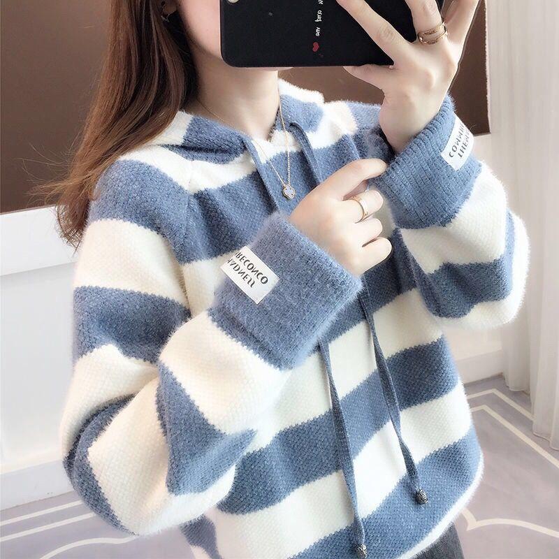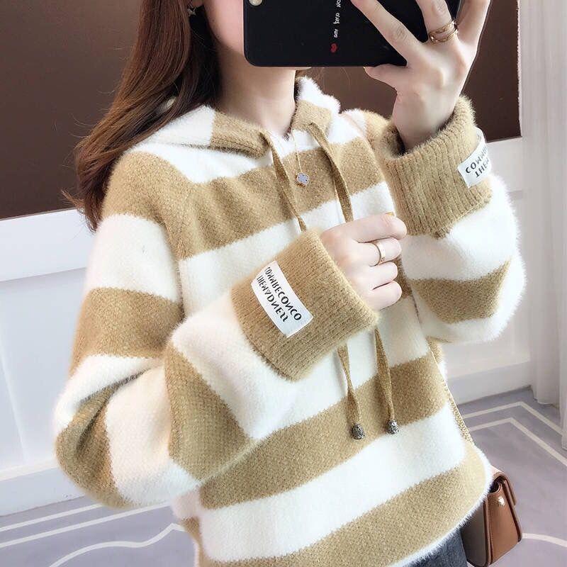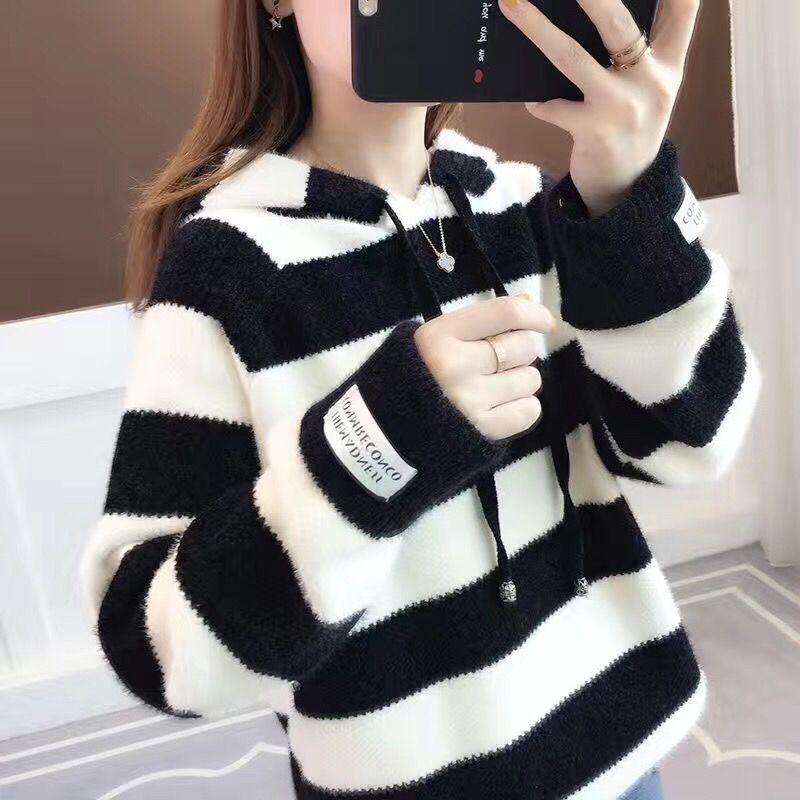 Пуловер, женский осенне-зимний свитер из норки, женский свитер, свободная полоса, свитер с капюшоном и длинными рукавами, пуловер