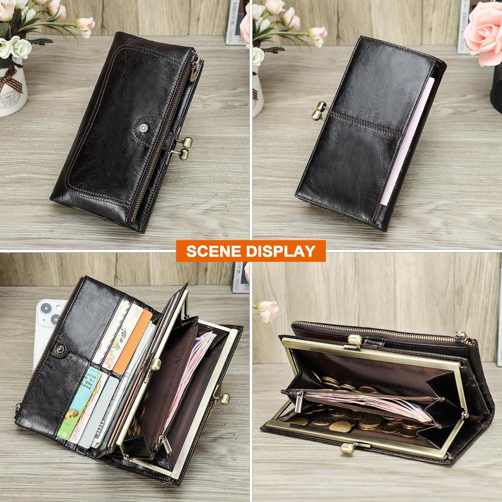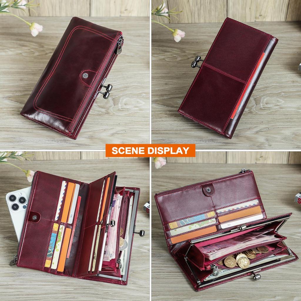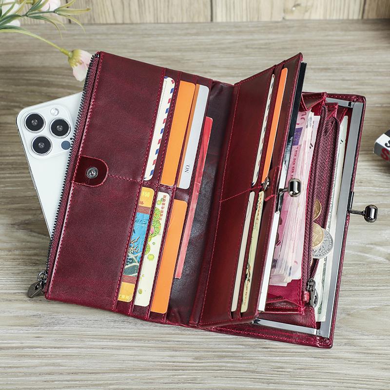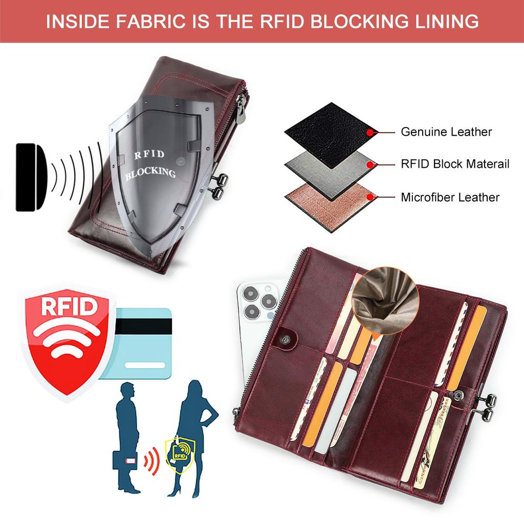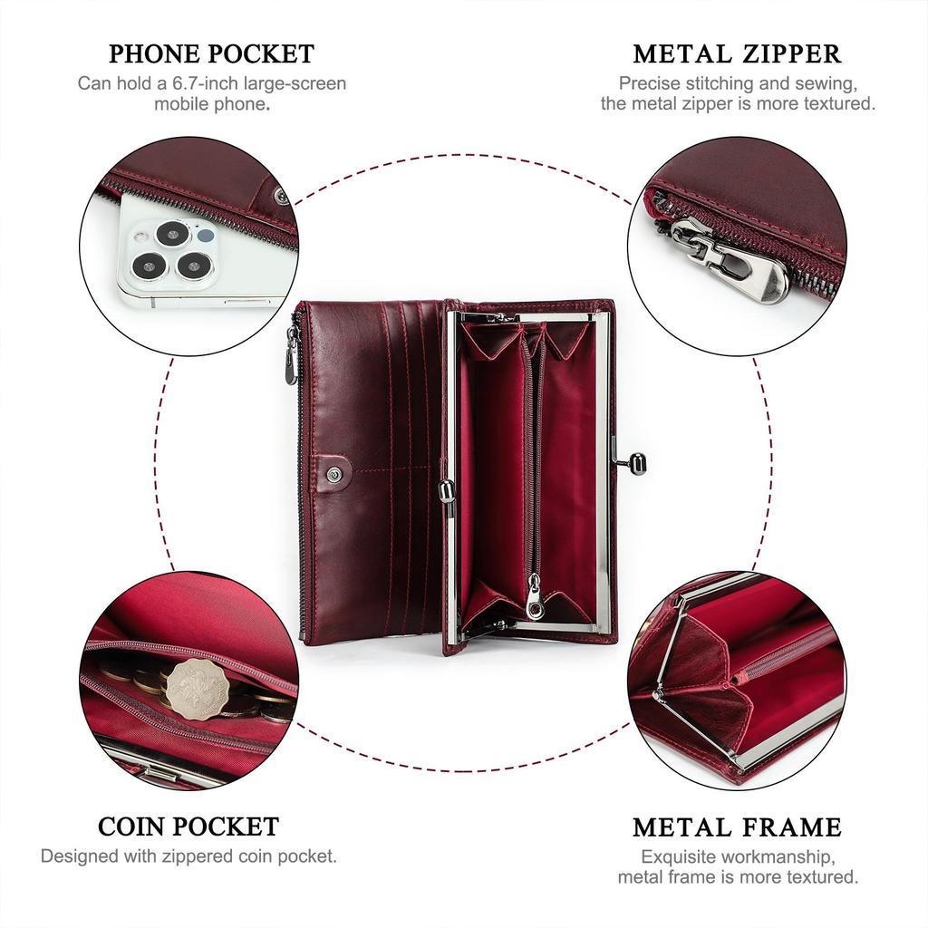 Женский длинный кошелек из натуральной кожи, металлический каркас, держатель для кредитных карт, застежка-молния, женский карман для монет, RFID-кошелек с 7-дюймовым карманом для телефона