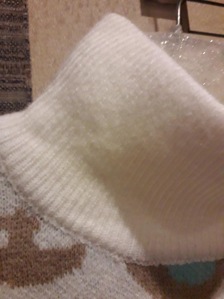 Хуже качества я ещё не встречала: рукав на 2,5 см один короче другого, линия плеча тоже на 0,5см одна меньше другой. Длина свитера не соответствует. Воротник перекошен. Сзади шов воротника посередине прерван и прострочен красными нитками. Две огромные до дыр затяжки. Сложен был безобразно: просто запихан в пакет. Пришёл весь помятый. Уважаемый продавец, а Вы хотели бы носить такой криво скроенный, весь в затяжках свитер, который стоит, между прочим, не две копейки? Огромное спасибо службе поддержки за помощь в решении проблемы!