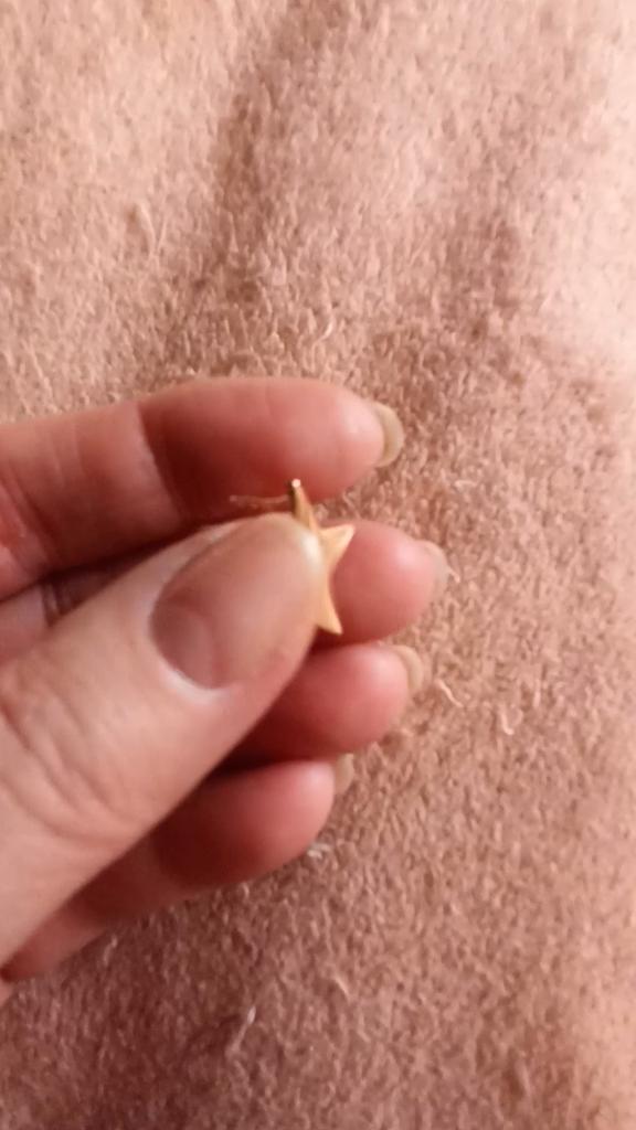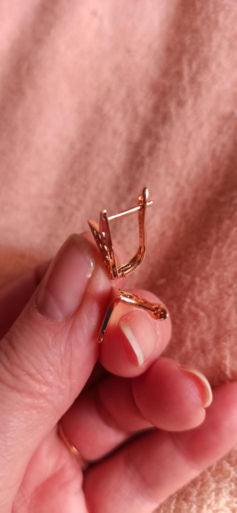 Серьги визуально не отличить от золотых. Стоит проба 585. На фото с золотым кольцом. Рядом с другой серьгой с Джума, видно, что та желтее