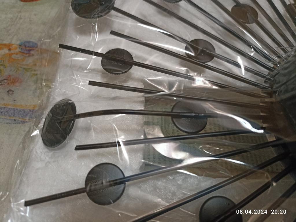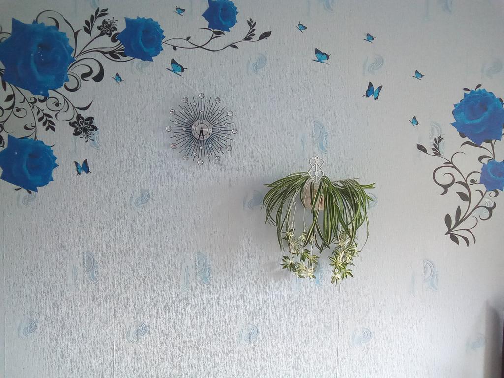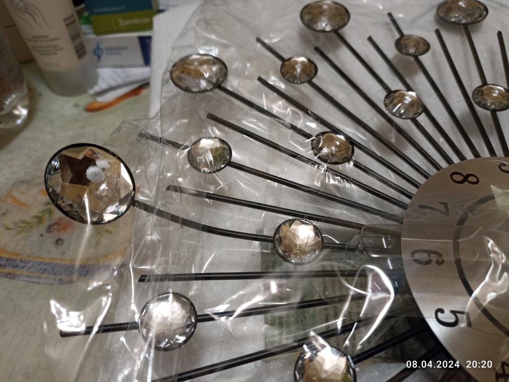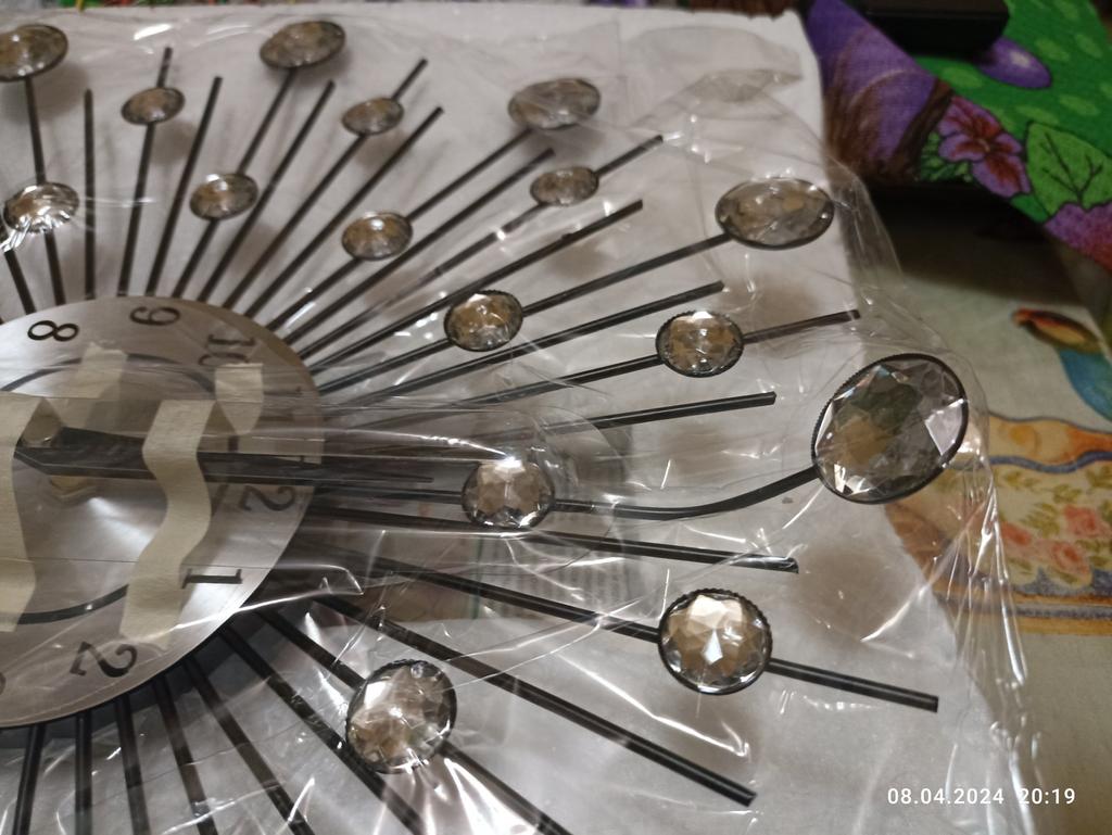 Часы оказались даже лучше, чем на картинке. На стене смотрятся очень красиво. Батарейки к часам не было, пришлось докупать. Зато положили евро гвоздик. Желательно бы циферблат побольше, уж больно он маленький для комнаты 16 кв.м. Наклейку на стену ( голубые розы), цветок и горшочек тоже заказывала на Джуме.