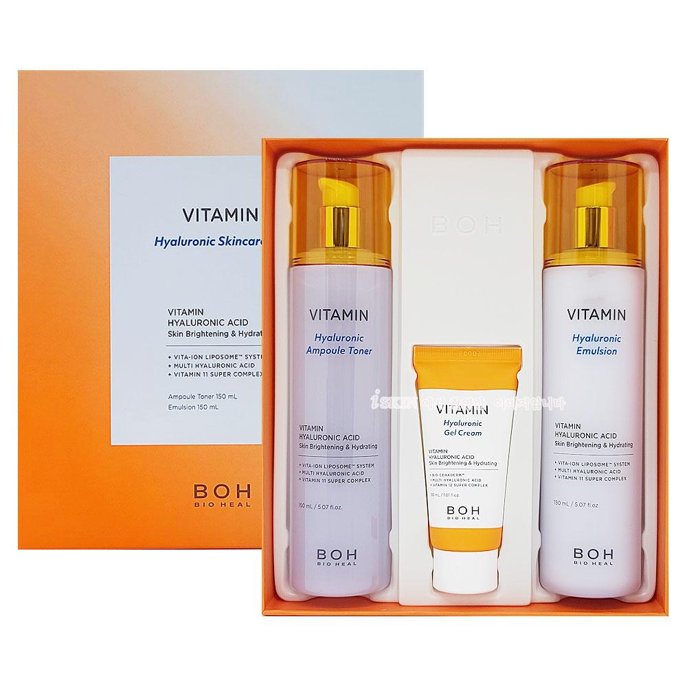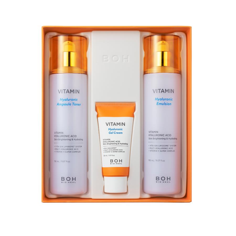 Набор для ухода за кожей включает 150 мл гиалуронового ампульного тонера, 150 мл гиалуроновой эмульсии и 30 мл гиалуронового гелевого крема.