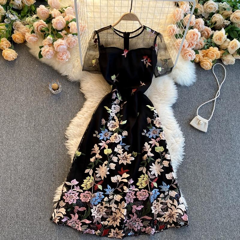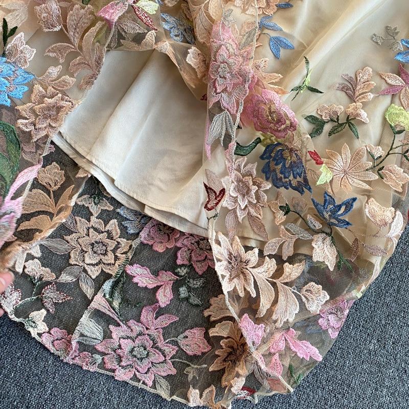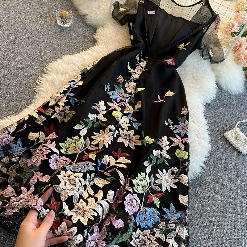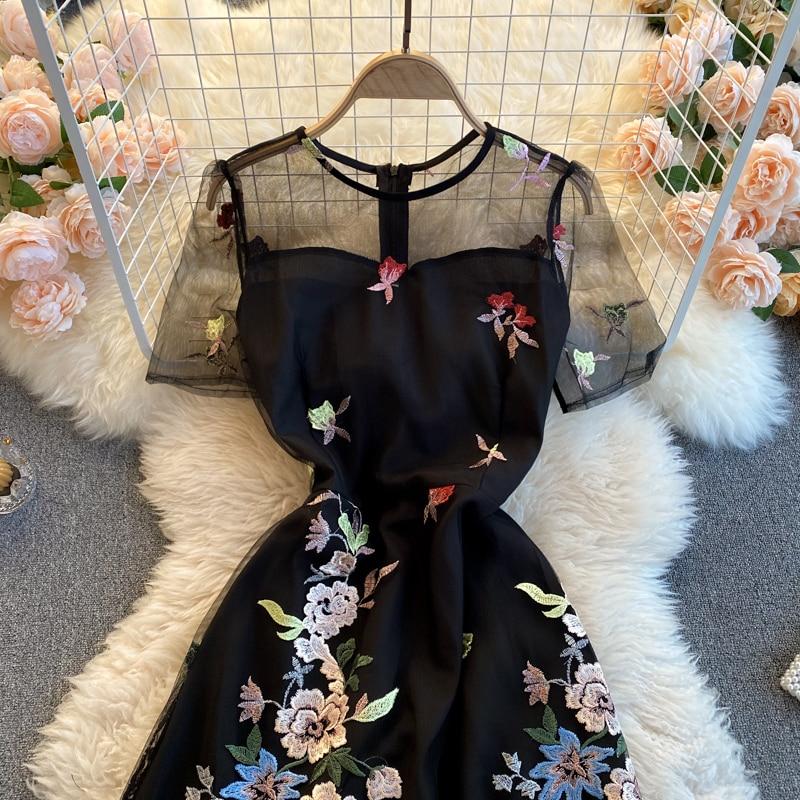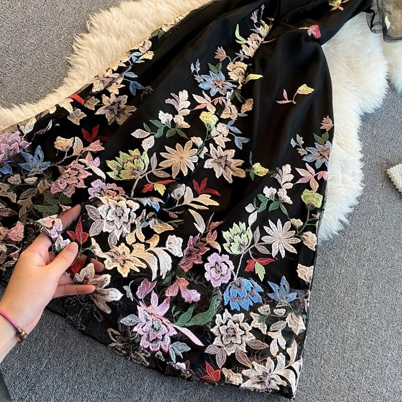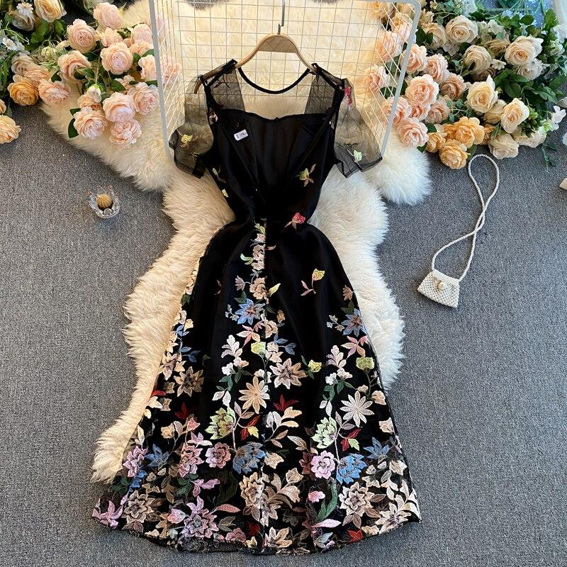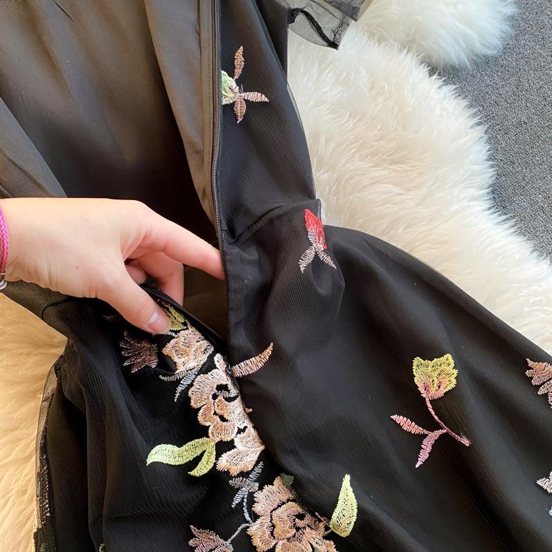 Новое сетчатое платье с вышивкой, светлое, для зрелого ветра, во французском стиле ретро, тонкое платье средней длины с принтом и подолом, облегающее талию