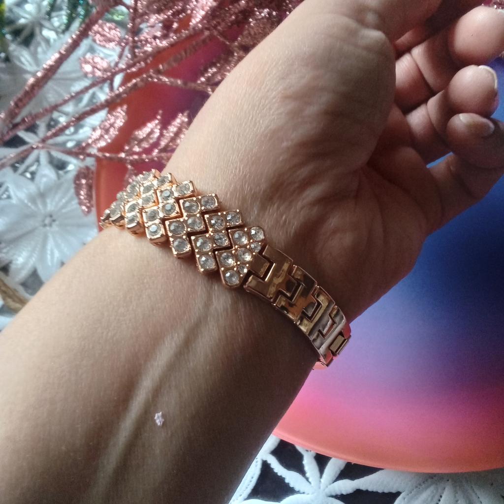 Нарядные, очень блестючие браслеты. Когда уже заказала , то случайно увидела у девушки такие же часы и браслет, но в серебряном цвете и тоже отлично смотрятся. Понравилось, что у часов белый циферблат. На запястье болтаются, но звенья убирать не буду, мне даже так больше нравится. Посмотрим, сколько прослужат часики. Спасибо Джум! Рекомендую!