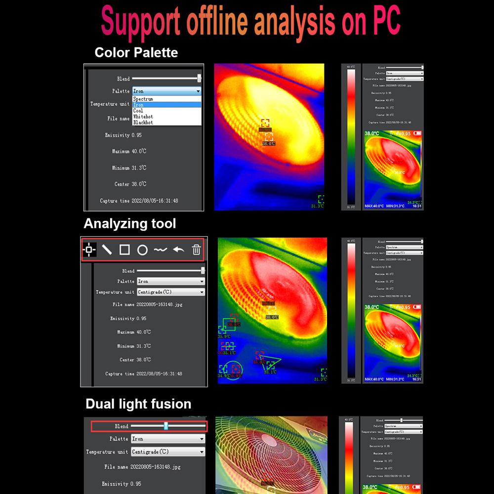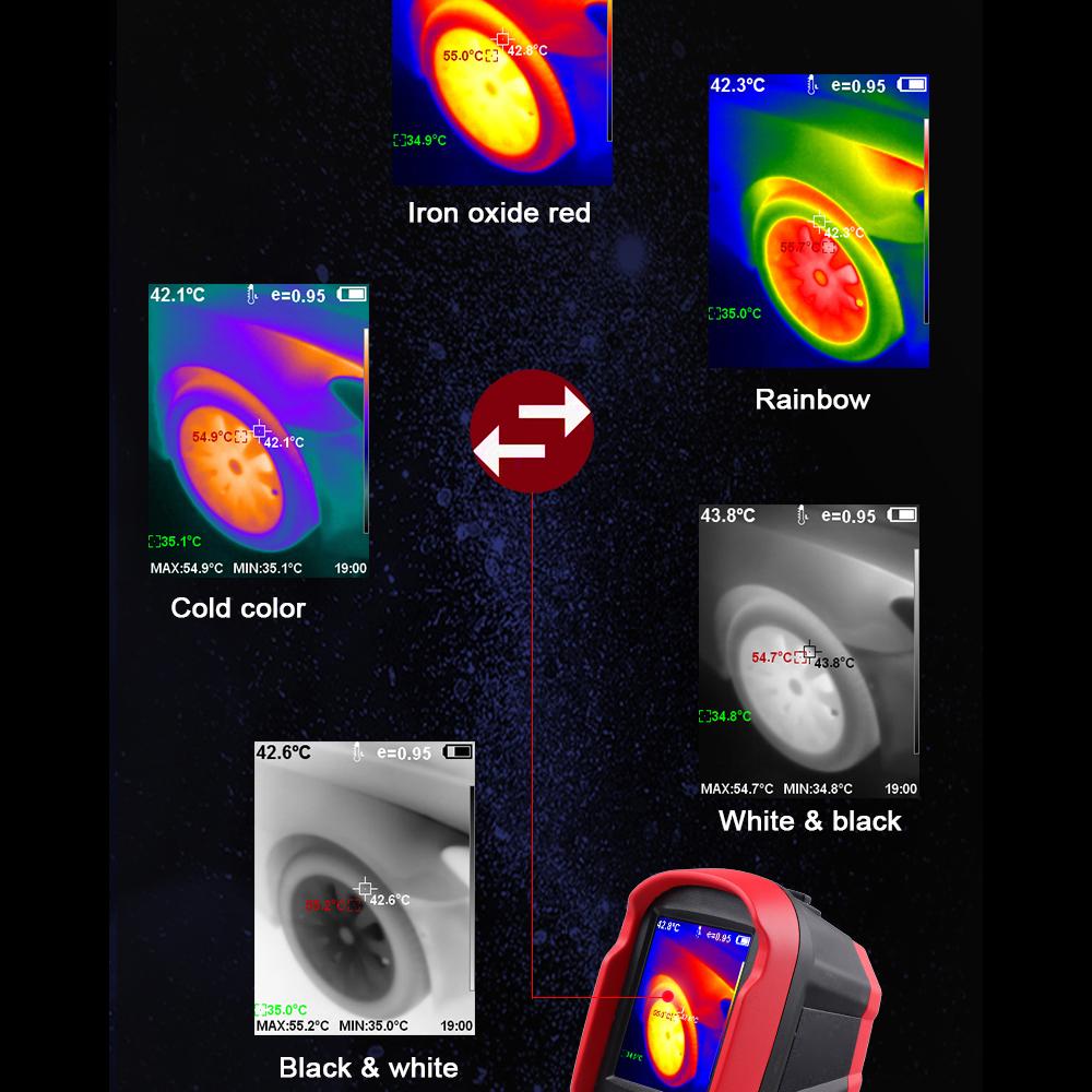 Пять режимов визуализации дизайн, вы можете приспособиться к радуге, оксиду железа красному, холодному цвету, черному и белому, белому и черному в соответствии с вашими потребностями или предпочтениями.