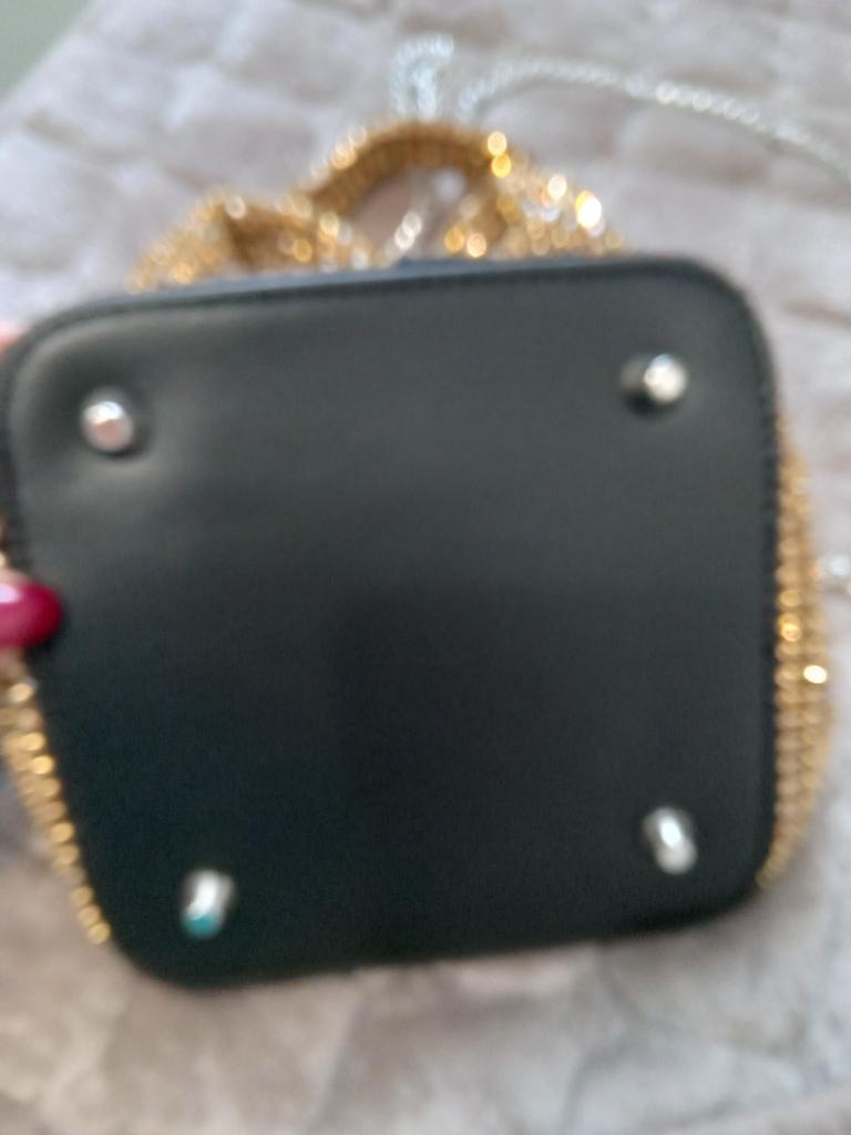 Полностью соответствует описанию, маленькая, но классная. Цвет вроде немного потемнее, чем на фото продавца, но всё зависит от освещения, при определённом свете цвет такой же. Вся сияет-переливается, очччень красивая! Качество идеальное, запаха нет, все стразы на месте, швы ровные, поверхность сумки ровная, гладкая, за одежду не цепляет, тактильно очень приятная, хочется гладить 😁😁😁. Есть ремень-цепь на карабинах, тоже очень красивый и гладкий, вложены в пакете запасные стразы (5 штук), донышко жёсткое, держит форму, имеются 4 металлические ножки, закрывается сумка на магнитную кнопку. Довольна как слон!!👍👍👍 Рекомендую!!!