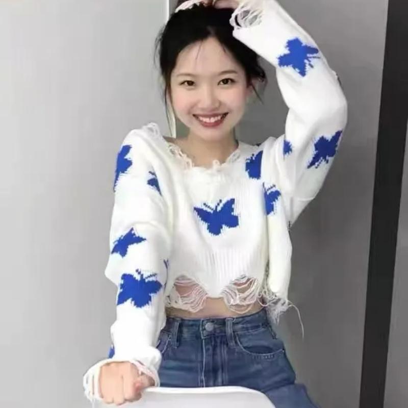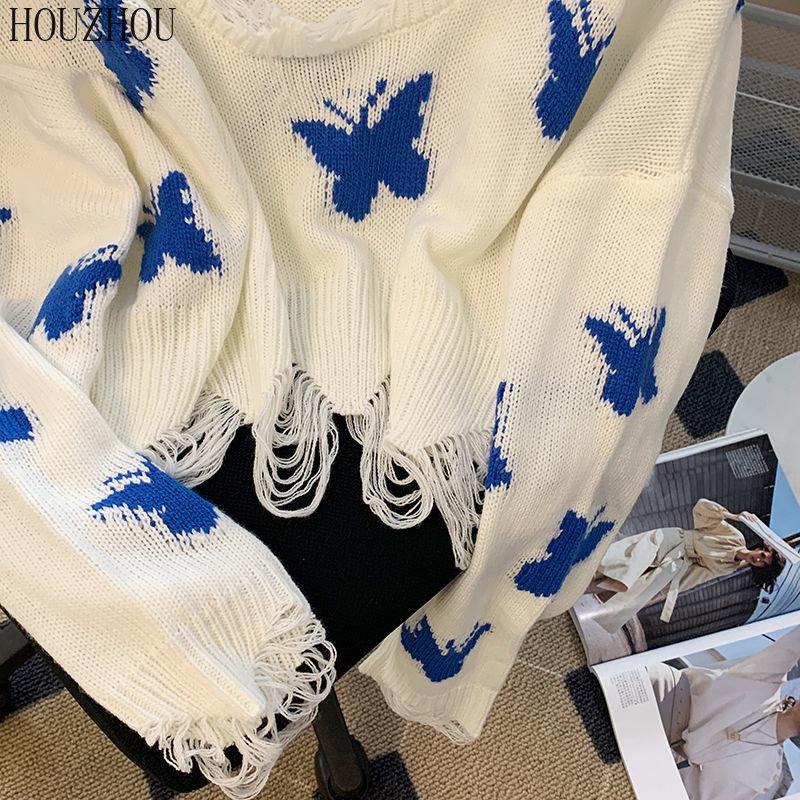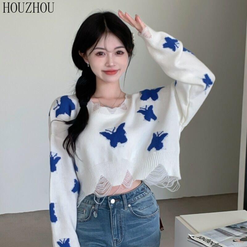 HOUZHOU свитер с бабочкой женский корейский вязаный Harajuku милый оверсайз повседневный свободный джемпер с открытыми плечами Y2K укороченные топы