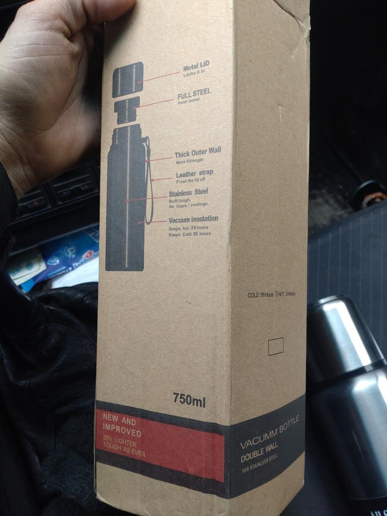 Такой классный термос! Воду держит, есть кружечка, удобная кнопка. Пока не проверяли сколько держит тепло. Коробка была мятая, но сам термос целый. Трек полностью отслеживался. Пришла смс-ка о доставке на почту
