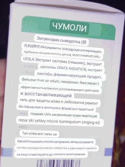 Сыворотка с центеллой и эктоином🤩🌿 Продолжаю пополнять коллекцию опробованных китайских сывороток👍 Такую купила впервые, но бренд знаком, уходовую косметику Chumolee заказывала уже. ✨Состав сыворотки внушает уважение (перевела, на фото) 🌿Объем 30 мл ✨Аптечная упаковка (как у стерильных порошковых и жидких лекарств) - гарантия "чистоты" средства 🌿После того, как сыворотка распечатана, надеваем колпачок-пипетку и пользуемся. У пипетки есть закручивающаяся крышечка: удобно ✨Срок годности - до октября 2025 💙Эктоин имеет свойство "притягивать" и "запечатывать" молекулы воды. Так что это отличное увлажняющее средство. Когда зимой воздух пересушен батареями отопления, важно увлажнять кожу. ❗❗❗Когда надеваете пипетку, будьте внимательны, она должна сидеть плотно (придется приложить усилия), иначе пипетка слетит, и средство может вылиться. Сыворотка понравилась, у меня всегда в ходу несколько, чтобы чередовать💕 Берегите себя💋