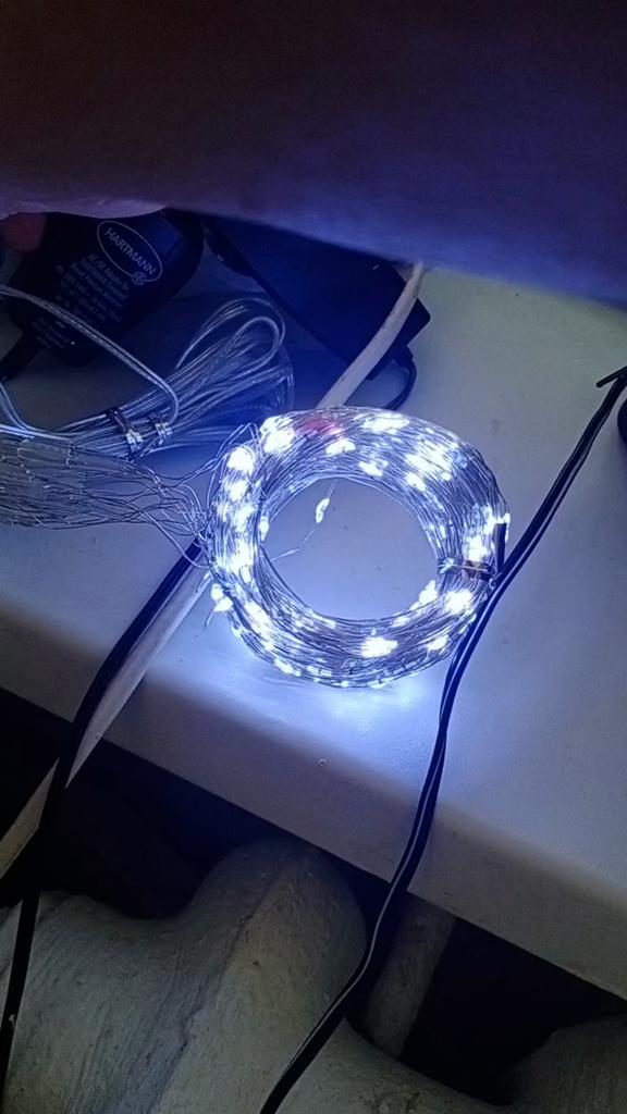 Гирлянду повесили дети в своей квартире. Все лампочки горят. Но у них в той комнате - жалюзи. Лучше бы смотрелись на шторах или тюли. Спасибо, Джум!