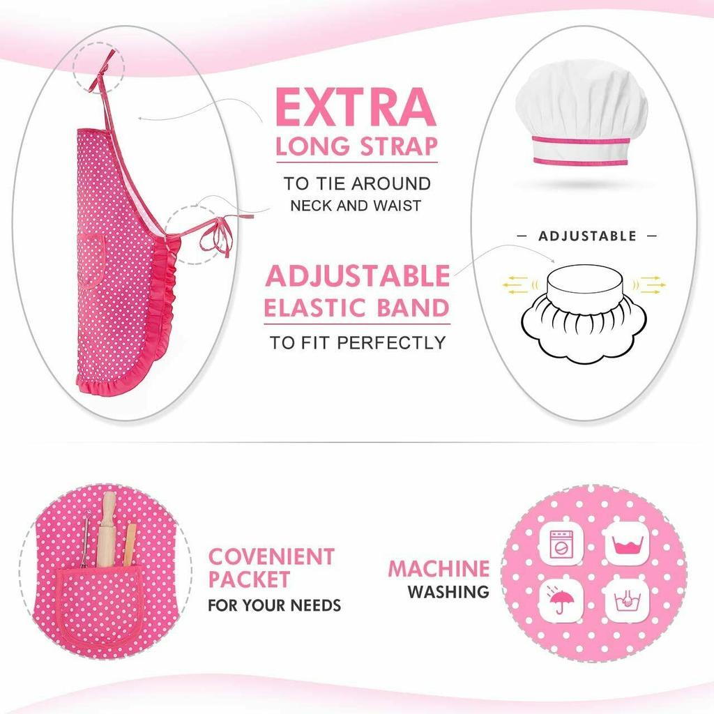 ДИЗАЙН ДЛЯ ДЕТЕЙ: Фартук и инструменты для приготовления пищи специально разработаны для детей, чтобы им было легче управлять инструментами. Шляпа шеф-повара с резинкой и фартук с регулируемой веревкой подходят для большего количества детей. Передний карман фартука можно использовать для хранения кухонных принадлежностей.