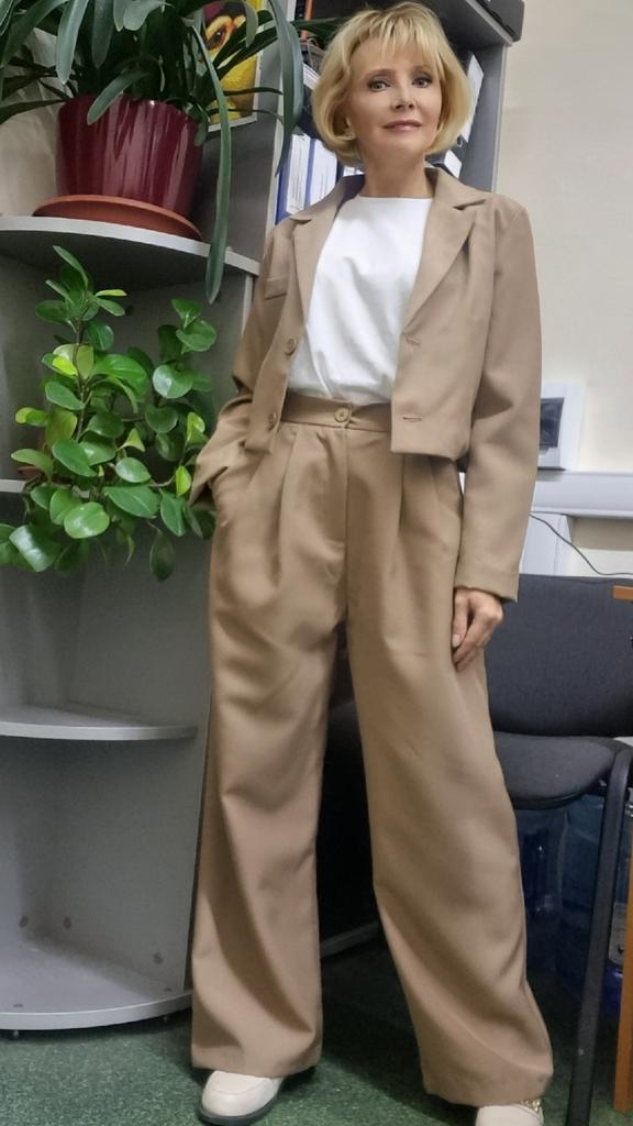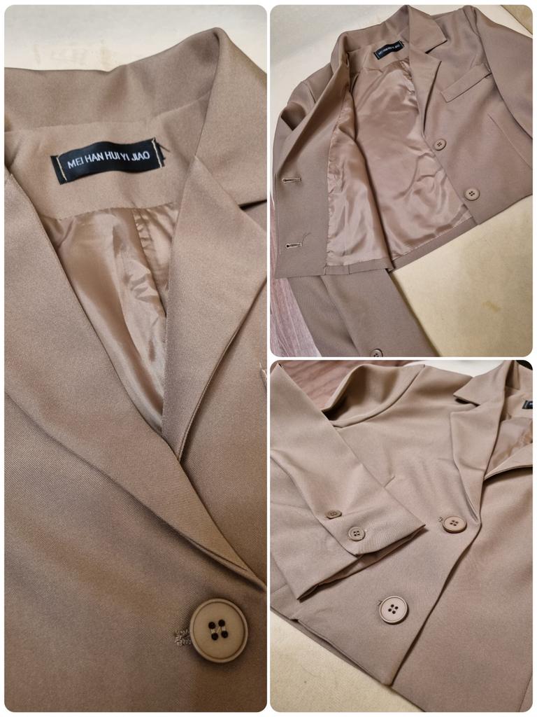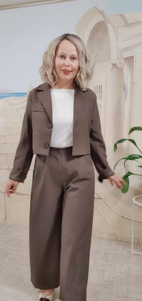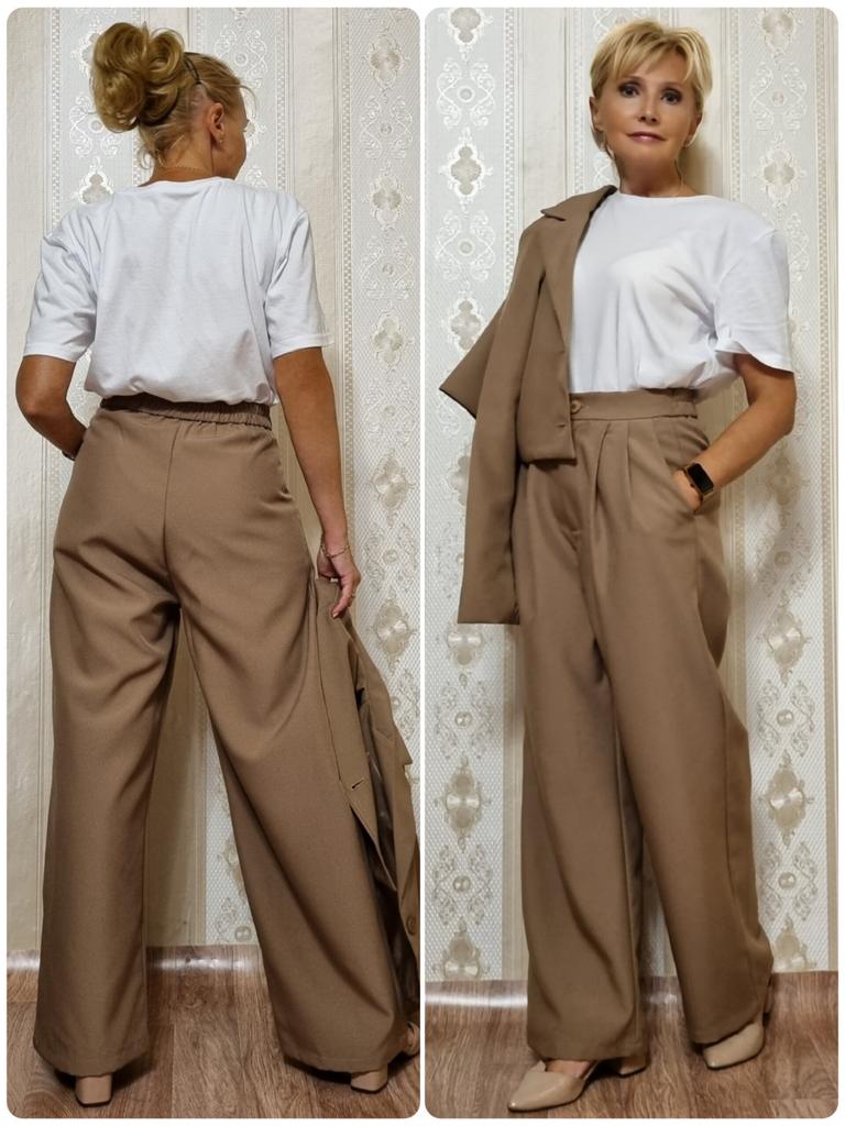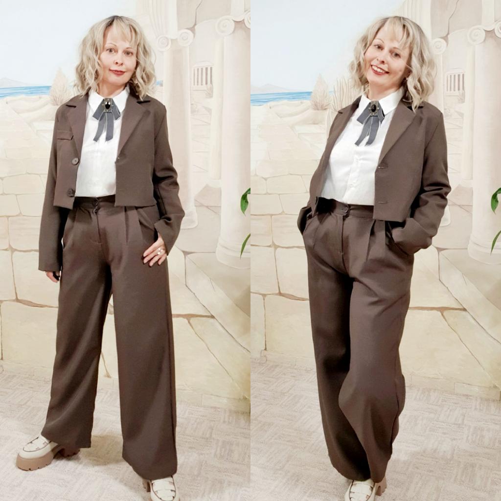 Брючный костюм с коротким жакетом, который точно не разочарует Жакет слегка оверсайз, но в меру, имеет чуть расширенные плечи, в талии не в облипку, хорошая полная длина рукава. Жакет отлично сочетается с брюками с завышенной талией. Брюки палаццо, имеют резинку в талии сзади, спереди по два защипа с каждой стороны для придания объёма в бёдрах, в боковых швах глубокие карманы. Костюм смотрится менее формально, чем классический, но очень женственно. Несмотря на небольшие огрехи в шитье (есть торчащие нитки), костюм хорошего качества. Ткань качественная, костюмная - полиэстер с плотным плетением нити, держит форму, поэтому брюки красиво струится и не смотрятся тряпочкой. Жакет на подкладке. Мои параметры 85×64×91, рост 150 см. Заказала размер S. Замеры жакета: грудь 96 см, талия 90 см, ширина плеч 37 см, длина рукава 60 см, длина по спинке 43 см. Замеры брюк: талия 60 см, бедра 116 см, глубина посадки 36,5 см, обхват бедра 63 см, ширина штанины внизу 51 см, длина внутреннего шва 66 см, полная длина 98 см. Выбор из пяти цветов: чёрный, слоновая кость, кофейный, розовый и мой - хаки. Мои искренние рекомендации. Личный промокод на скидку 5% на любые товары joom: HR2VHZURD4. Приглашаю в мой телеграм-канал followmekanal.