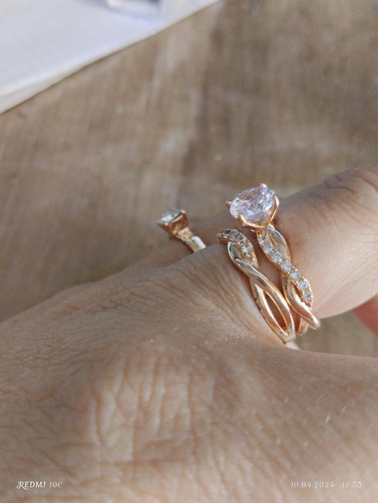В составе 2 колечка, за золото не подходит, немного другого цвета, сильнее блестят, камешек с голубым еле заметным оттенком.