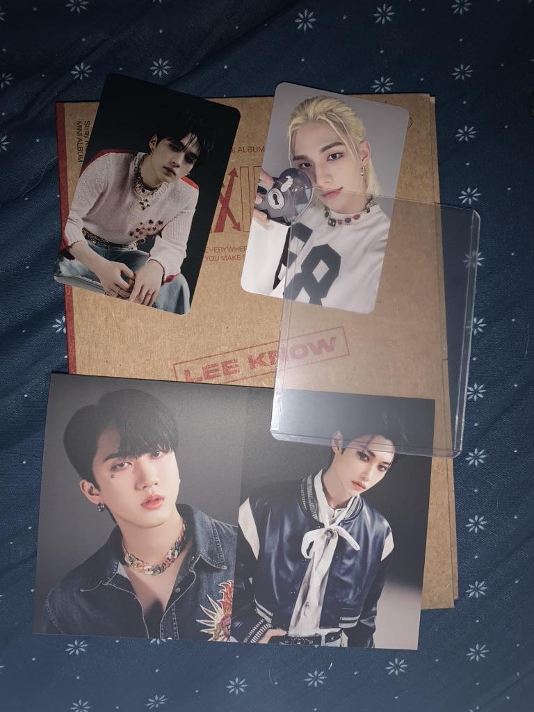 заказ отправили 15.12, забрала 15.01! отслеживался отлично, приехал без дефектов. в подарок положили милейшую карточку с Минхо и твердый протектор, за что отдельное спасибо!!✨ ну а чанликсы и карта с Хёнджини 🥺❤️🩹