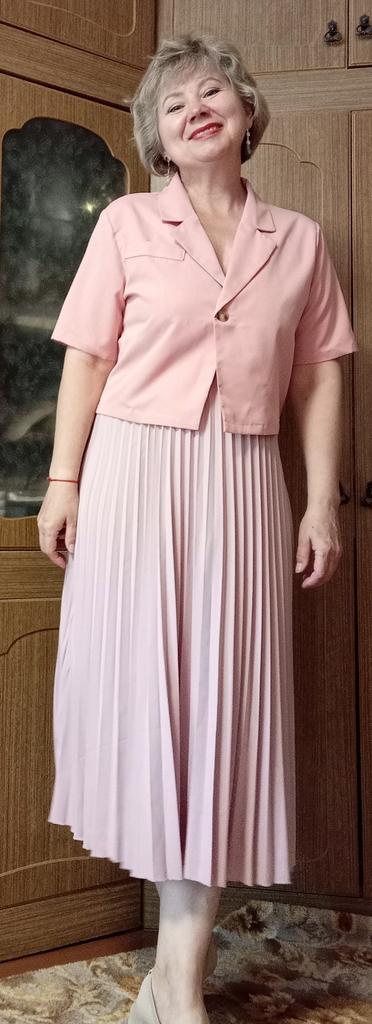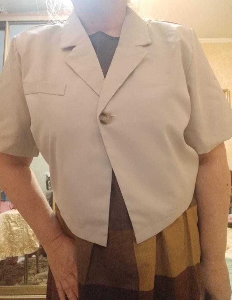Укороченный летний жакет от известного бренда VONDA 👍. Решила пополнить свой летний гардероб ещё одним жакетиком. Выбор пал на этот и я нисколько не пожалела. 🧥 Правда немного переборщила с размером. В последнее время я ошибаюсь в плюсовую сторону и заказываю размер больше, чем надо. С слову говоря, VONDA не грешит маломерками, чаще всего все вещи идут в размер, но я упустила сей факт. На ОГ-112 заказала самый большой размер 5XL, а нужно было на пару размеров меньше. Ну да ничего, можно ушить или носить так, мне в этом жакете, в любом случае, комфортно. Замеры жакета: ОГ-128 см, длина рукава 27,5 см, окружность рукава 45 см, длина жакета 54 см, на рост 168 см примерно до талии, рукава чуть выше локтя. 🧥 Модель жакета полностью соответствует промофото. Воротник классический - отложной английский. Жакет застёгивается на одну пуговицу. При желании можно добавить пуговицу и проделать петлю для неё. Вверху с правой стороны карман-обманка. Жакет с вшитыми плечиками (фото 9), без подклада и без выточек. 🧥 Качество пошива изумительное, придраться не к чему. Швы ровные, обработка краев аккуратная, торчащих ниток нет, посторонних запахов тоже. 🧥 Написано, что ткань полиэстер. Но полиэстер это очень объёмное понятие. Это достаточно полный полиэстер, который хорошо держит форму изделия. На ощупь даже кажется, что в составе присутствует хлопок. 🧥 В магазине этот жакет был представлен в трёх расцветках: розовый, жёлтый и бежевый. Мне захотелось бежевый цвет. А так же широкий размерный ряд: от S до 5XL. Сейчас бежевый, к сожалению, распродан, но другие цвета тоже хороши. Возможно позже закажу себе жакет другого цвета и поменьше размером. 🧥 До почтового отделения Алматы посылка шла ровно месяц. Жакет был аккуратно упакован в фирменный зип-пакет магазина. Покупкой очень довольна! 👍 Всеми руками рекомендую этот жакетик. Он отлично сочетается практически с любыми летними вещами и прекрасно дополнит ваш образ.