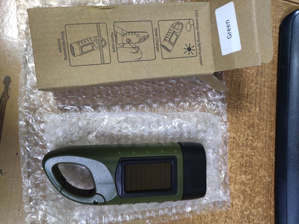 Отличный фонарик. Три диода светят не очень ярко, но достаточно. Светил целый час, потом стал тускнеть. Покрутил ручку несколько минут, опять светит нормально. Солнечные батареи не проверял пока. Закажу ещё парочку таких фонарей.