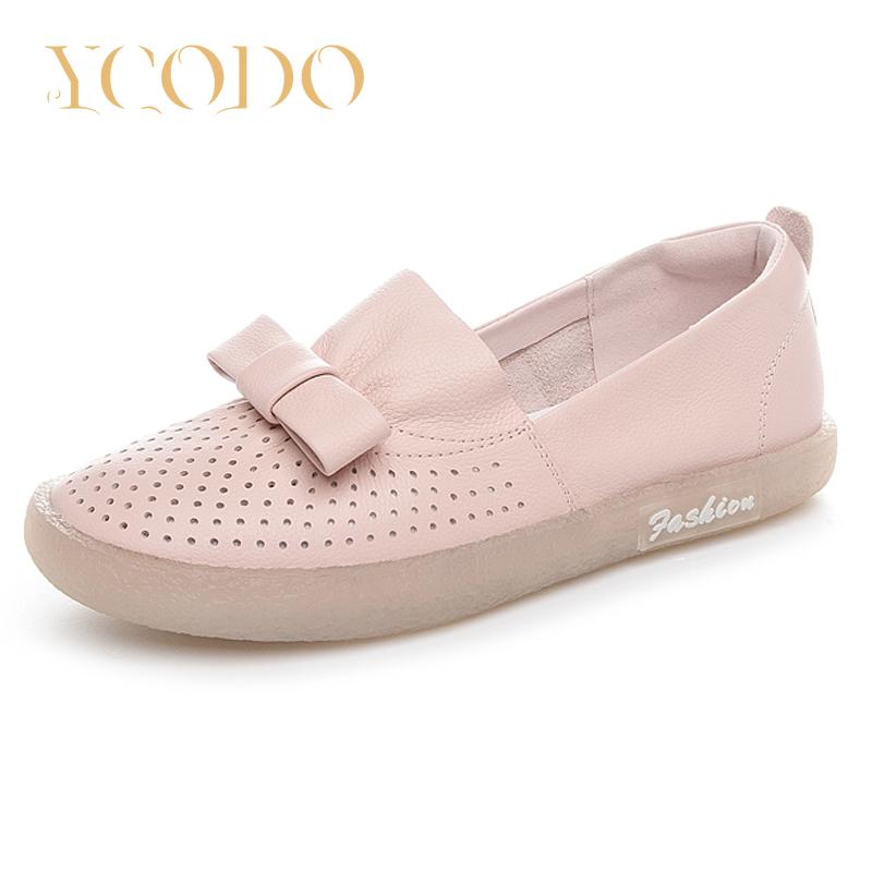 Весенне-летняя женская обувь из натуральной кожи с мягкой подошвой и открытыми отверстиями, удобная нескользящая обувь для беременных на плоской подошве с бантом