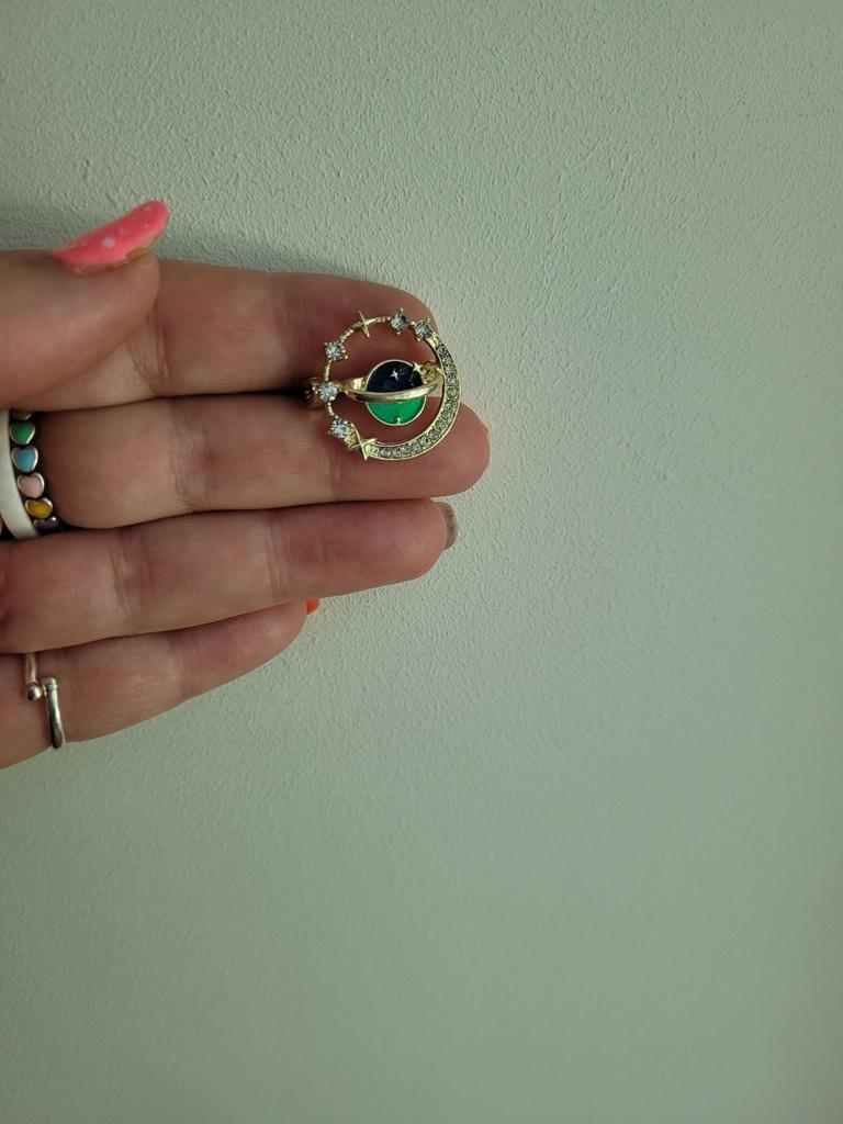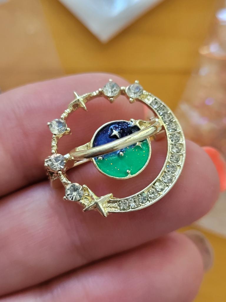 Брошь планета, ширина2,3 см. В середине броши земля-зеленая, небо-синее, если ее поворачивать, то на синем поблескивают темно- розовые мелкие, мелкие точечки-красота вокруг земли - орбита, но она с лицевой стороны. Сама брошь - круг на верху над небом белые камушки-переливаются, внизу круга- земля месяц в мелких камушках. С описанием согласна, но реально КРАСИВЕЕ. Сделана качественно. Спасибо!