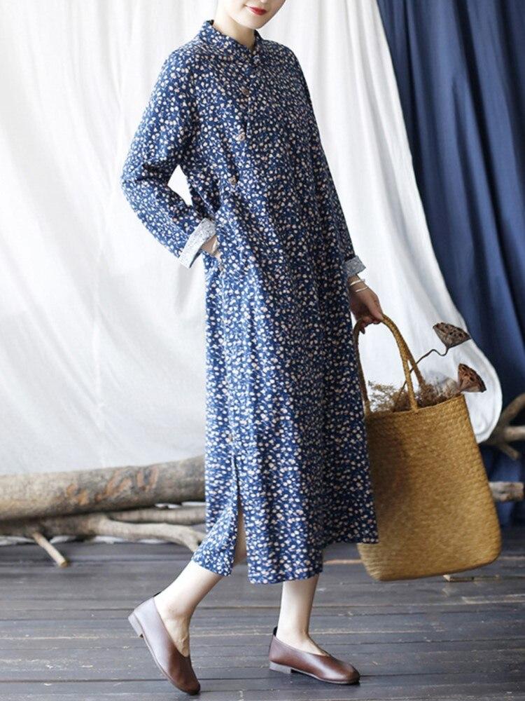 Johnature Женское винтажное хлопковое платье с длинным рукавом и цветочным принтом Cheongsam, осеннее женское платье на пуговицах