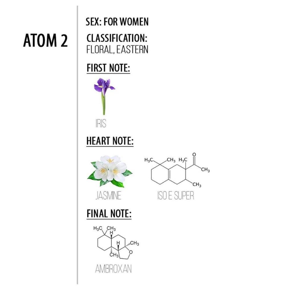 Аромат Atom 2 полностью повторяет обонятельную структуру своего предшественника и построен вокруг единственной ноты теплого амброксана.. Кому-то его звучание напоминает запах чистого вымытого тела, многие улавливают ноты беззаботного морского бриза, свежести весеннего ветра, а есть и те, кто называет запах волшебным поцелуем первозданной природы.. Полнота и многогранность аромата достигается только после контакта с кожей владельца, поэтому в полной мере оценить его красоту можно только нанеся духи на тело.