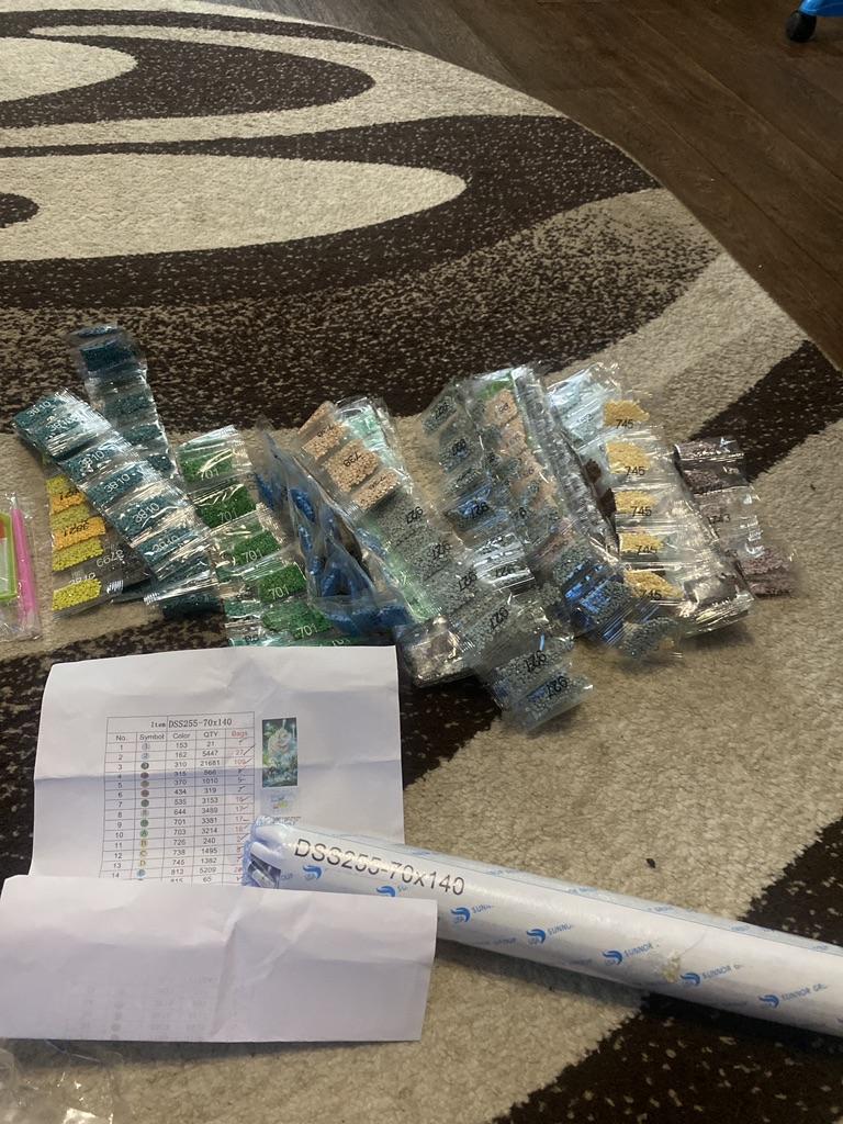 Картину получила быстро, за месяц. Упаковано было аккуратно, без заломов. Только вот верхнее покрытие такое плотное, таких ещё не встречала. Да и алмазики расфамованы по маленьким запаенным пакетика, что лично мне очень неудобно. Хватит ли их? Такое ощущение, что алмазиков очень мало, а картина большая... Ну, начнём выкладку , а там посмотрим. Рекомендую к покупке. Спасибо продавцу и Джум.