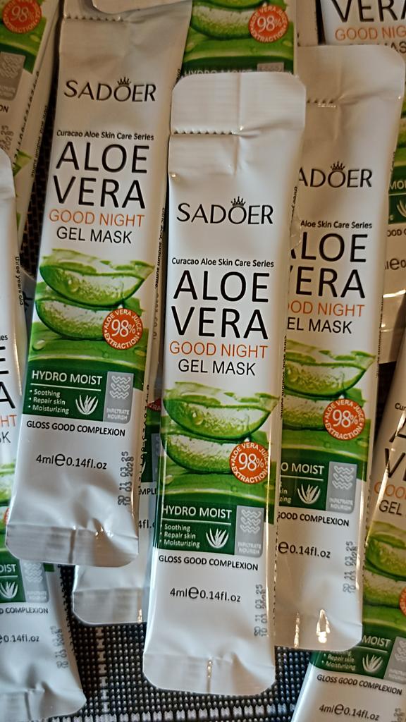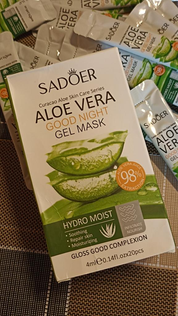 Ночная несмываемая маска для лица с Алоэ Вера. В упаковке 20 пакетиков по 4 гр каждый Содержит витамины, минералы, ферменты, микроэлементы, аминокислоты... Лёгкая текстура с приятным запахом, быстро впитывается не оставляя липкости. Наносим на очищенное лицо за 30-40 минут до сна, не смывая. Используем 2-3 раза в неделю вместо крема. Подходит для всех типов кожи. Питает и смягчает кожу во время сна, увлажняет и восстанавливает, возвращая ей упругость и тонус. Также оказывает противовоспалительное и заживляющее действие. В результате кожа выглядит свежей, сияющей и отдохнувшей. Классные масочки. Доставка быстрая на удивление, всего 17 дней, упаковка хорошая, продавцу большое спасибо.