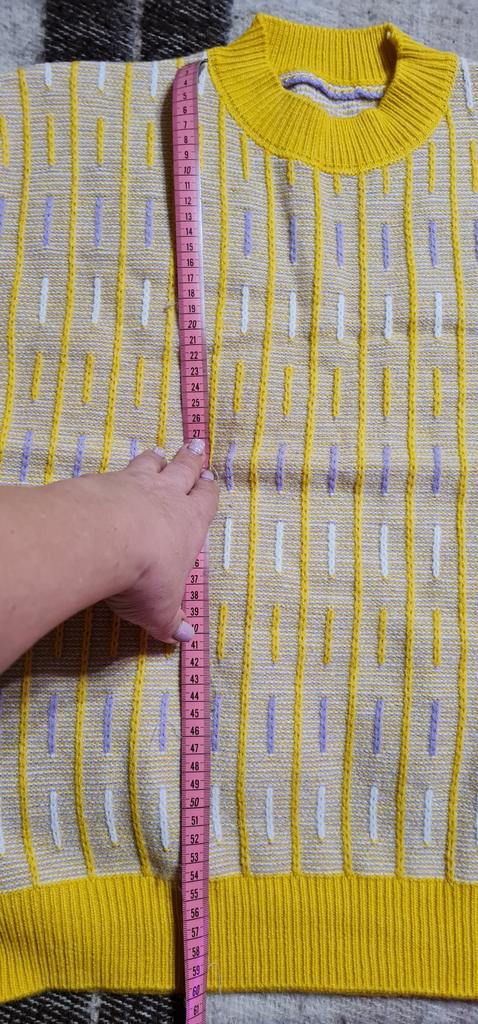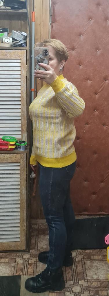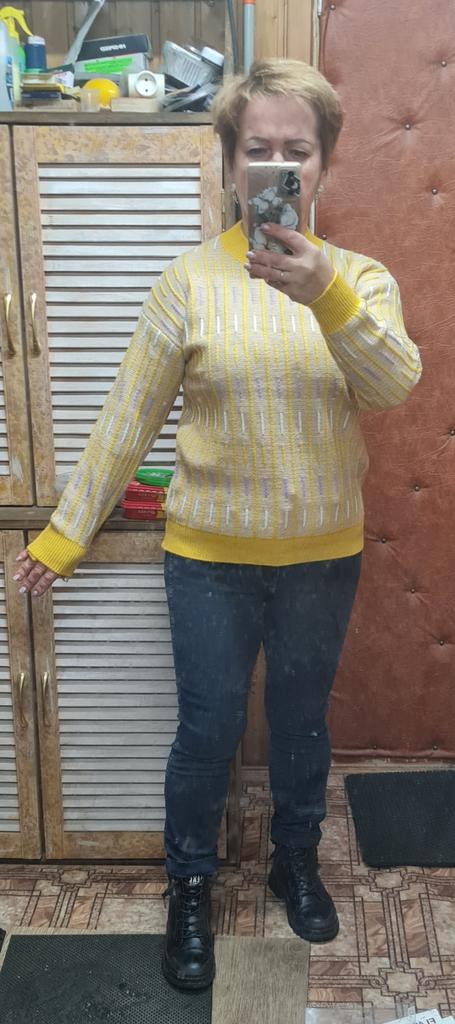 Свитер подошёл по размеру,но мне немного давит ворот,я так не люблю, поэтому намочила водой и растянула на банку,стало лучше.Ну и слегка колет ,если одевать на тело без майки.Вот такая я привиредливая, а так выглядит хорошо.