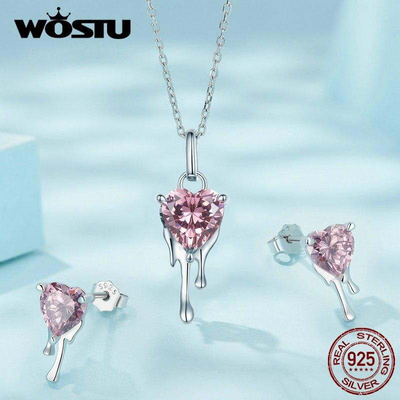 WOSTU Стерлингового серебра 925 пробы, ослепительные розовые циркониевые серьги в форме сердца и ожерелье с подвеской для женщин, комплект ювелирных украшений, свадебный подарок