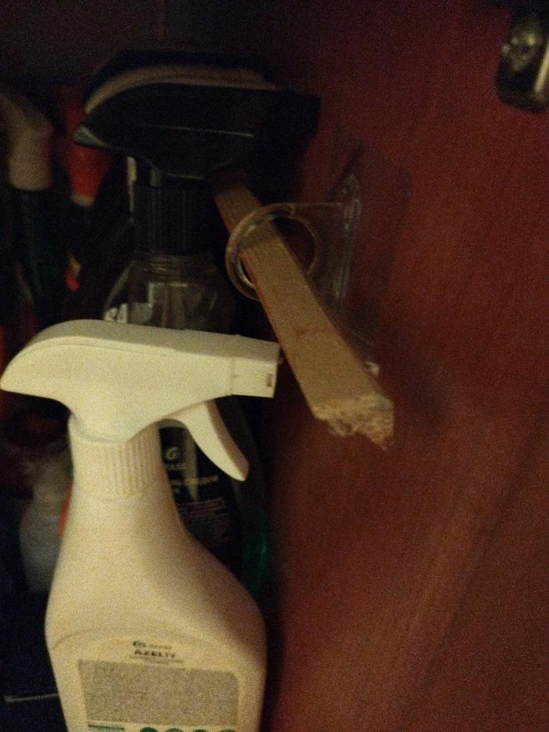 приклеилась отлично ,сначало я протерла спиртом место куда хочу приклеить ,а затем и эту штучку приклеила ,и повесила швабру губку из вспенинного ПВА, на край швабры надела крючек.,держит отлично.
