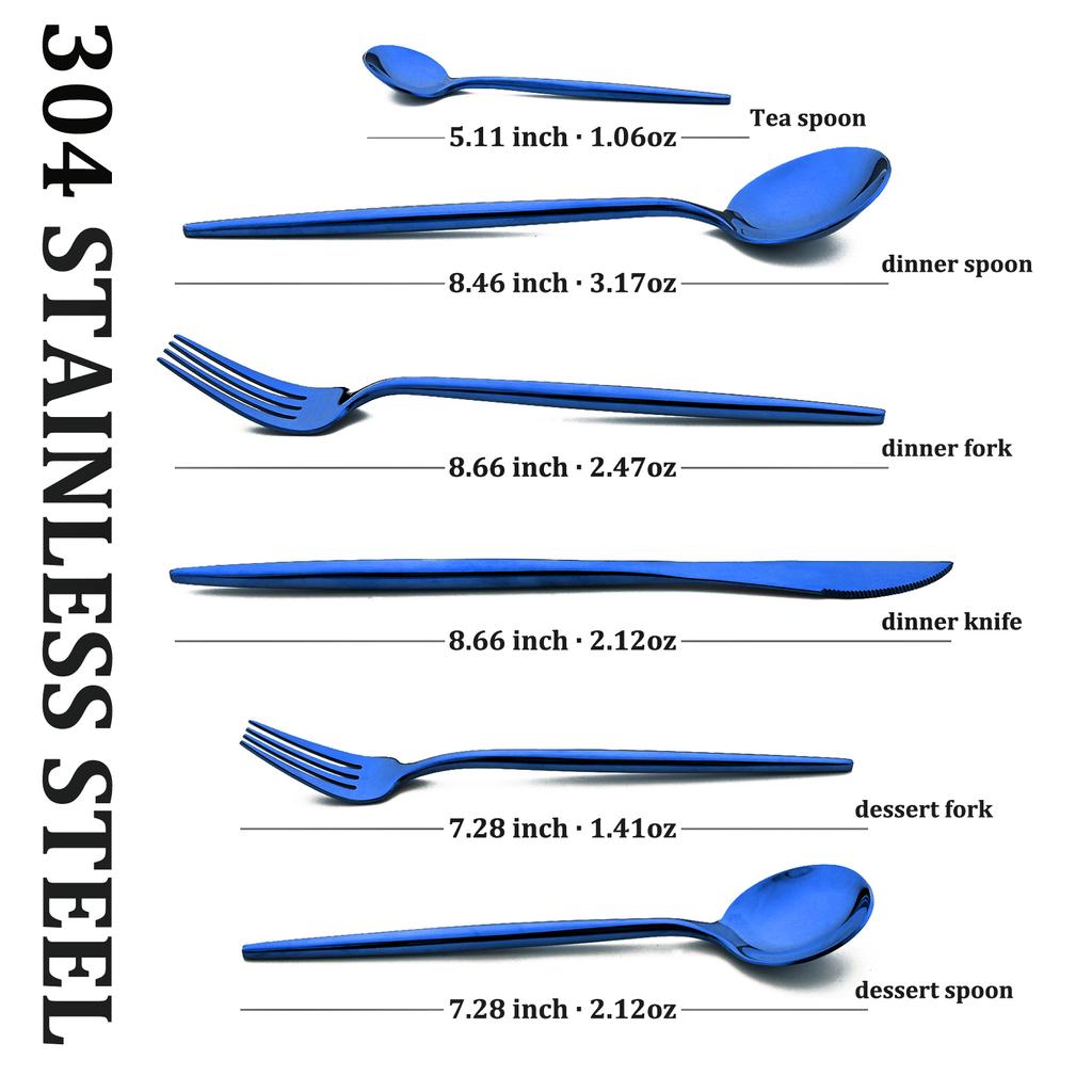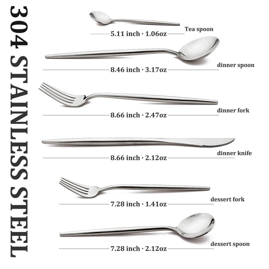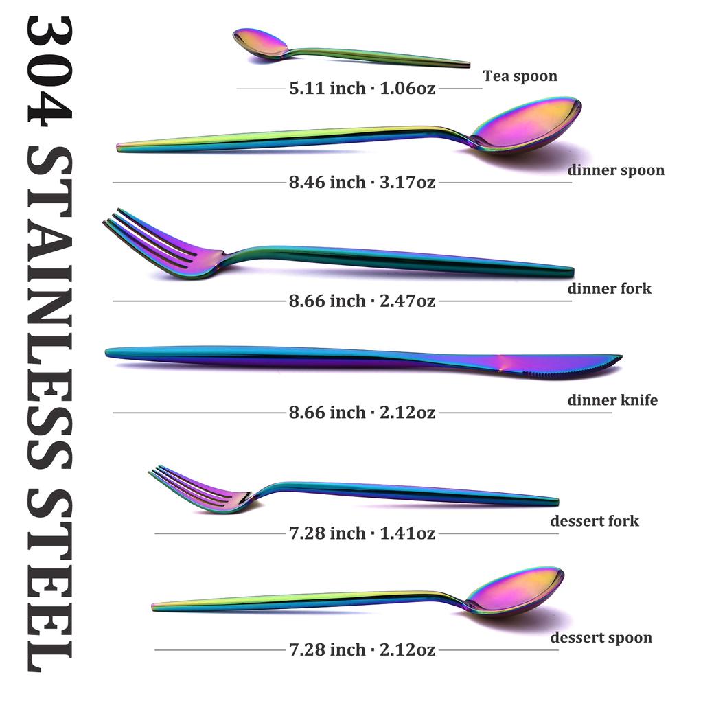 Пакет включает: 1 шт обеденный нож + 1 шт столовая вилка + 1 шт столовая ложка + 1шт десертная ложка + 1шт десертная вилка + 1шт чайная ложка