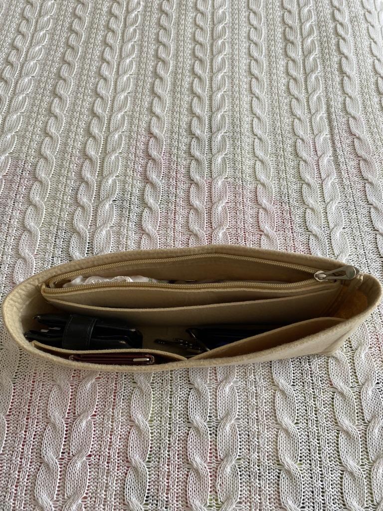Эта сумка задумывалась ,скорее всего, с целью быть вкладышем в сумку-шоппер или иные подобные большие сумки, в которых не предусмотрено отделений и карманов. Этот вкладыш помогает организовать и упорядочить все ваши важные мелочи: ключи, проездной, кошелек, салфетки расческу, губную помаду и прочую косметику, телефон , зарядник и многое другое в вашей большой сумке, сразу найти то , что нужно, а не долго рыскать и копаться в ней. А еще такой вкладыш просто спасение для тех девушек, которые любят часто менять свои основные модные вместительные сумки, подбирая их к образу или по погоде! Достаточно одного движения руки и все жизненно необходимые вещицы уже в нужной сумке! Размер: длина=36 см, высота=16 см. Теперь о качестве. В описании сказано, что сумка-вкладыш выполнена из фетра и я, зная не особую прочность и истираемость фетра, думала, что она быстро придет в негодность, но решилась купить, благо цена невысока. По факту была приятно обрадована достаточно плотным, держащим форму материалом и несомненно, что он прослужит дольше, чем фетр. Внутри предусмотрены два кармана и три отделения на всю длину: узкое, пошире и одно на молнии. Для меня все очень продумано и удобно.