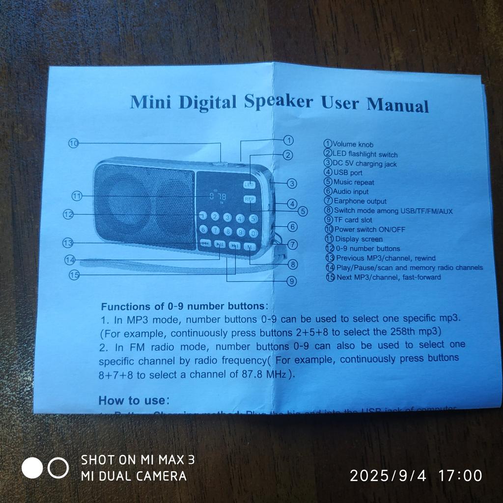 Доставка посылки 28 дней, два раза продливали рекомендуемую доставку. Y-501 Мини FM-радио, цифровой портативный MP3-аудиоплеер в комплект которого входит: аккумулятор, кабель для зарядки, инструкция на английском языке, упаковочная коробка (микро SD-карта и USB флешка поддержка в формате FAT32 в комплект не входят); в данном устройстве нету стерео динамика, обычный моно динамик и рядом установлена пассивная мембрана для усиления мощности до 3 Вт, что не соответствует описанию продавца. P.S. Рекомендации продавцу: устройства описуйте правильно, советуясь с профессионалами электронной техники. Не рекомендую покупать это устройство, так как в нём установлен обычный моно динамик с пассивной мембраной, а не стерео динамик, как описывает продавец, этим продавец обманывает покупателей, обман чистой воды...