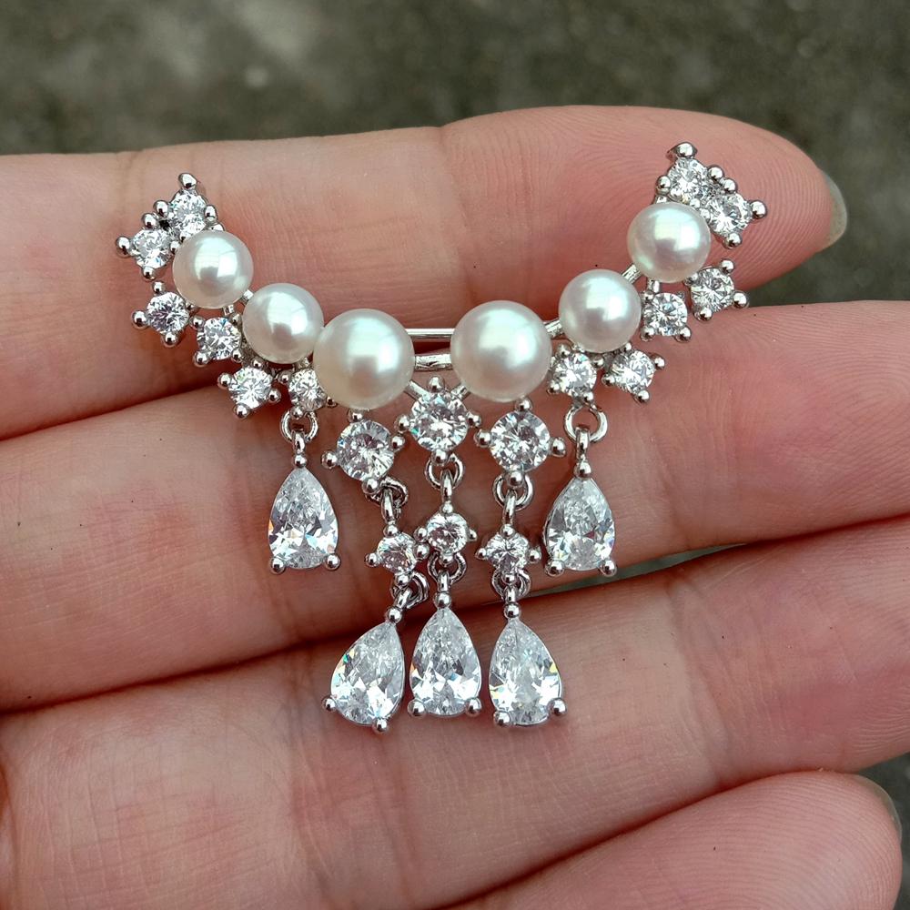 Брошь с натуральным пресноводным культивированным белым жемчугом и фианитами, покрытая серебром