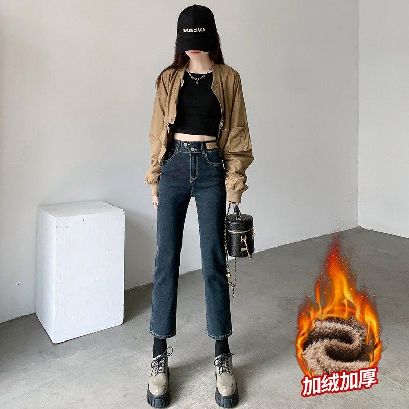 Осень-зима, популярные женские брюки с высокой талией, простые повседневные утолщенные теплые уличные брюки, эластичные прямые брюки, винтажные женские джинсы — купить товар онлайн с бесплатной доставкой по всему миру!