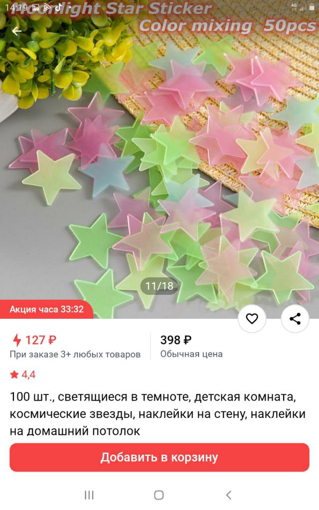 Получила свои звёздочки, немного разочарована, так как ожидала того, что описал красочно продавец ! Держала их на свету , но они не засветились в темноте! Затем держала их под ярким светом настольной лампы, они слабо -слабо вроде бы, ели-ели засветились, но меня такой эффект не устраивает и не создаёт праздничного вида и настроения, для чего, собственно, они и были куплены. Звёздочки маленького размера, на фото продавца выглядят крупнее. Не поленилась, посчитала! Из обещанных 100 штук, прислали 87 шт. Экономия,хотя продавец предупреждал, что может быть меньше на 5 штук.,но не на 13шт! Создать яркий звёздный пейзаж не получилось, очевидно низкое качество материала из которого сделаны звёздочки! Обещанный внуку новогодний подарок, не получился! Получилась ,,туманная Андромеда!,,