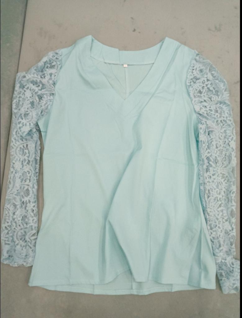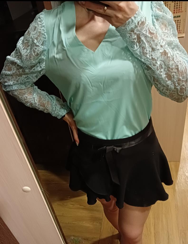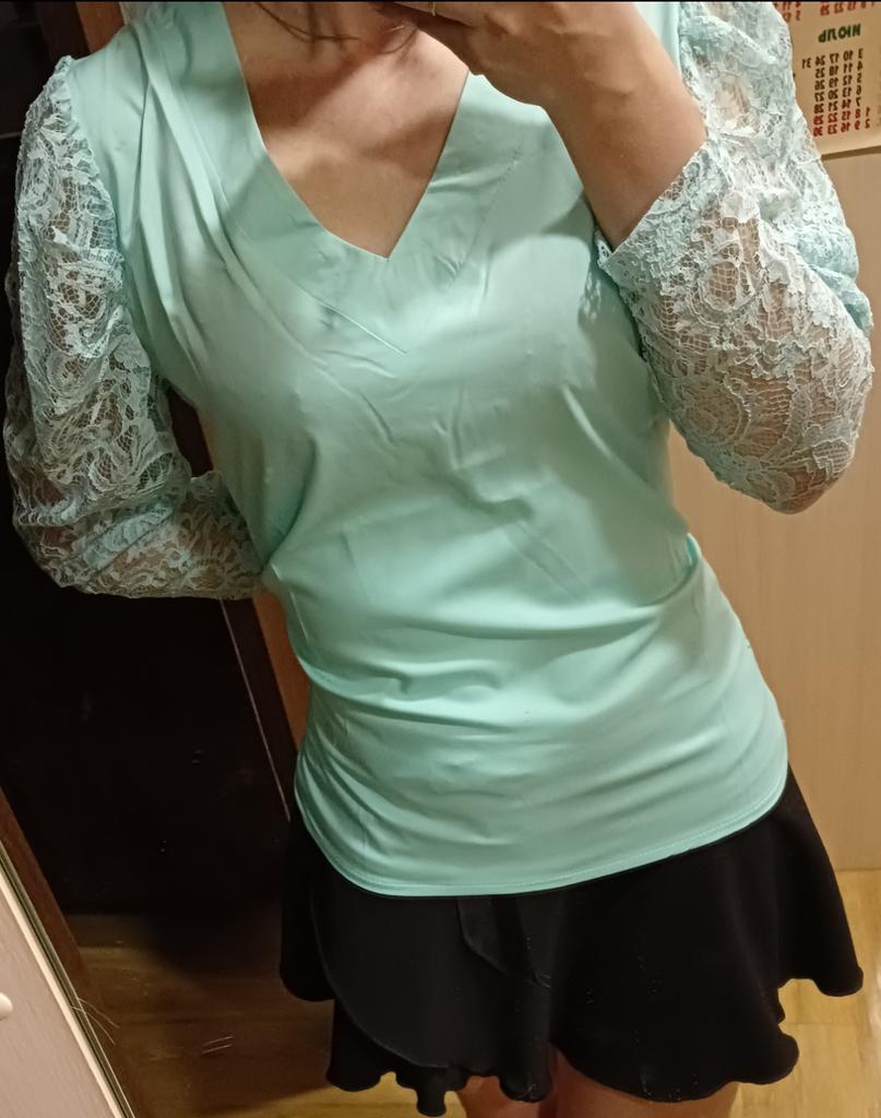 Заказывала, когда не было ни одного фото в комментариях (в марте), только сейчас добралась до написания отзыва. Доставка месяц, упаковано хорошо. На реальный размер s, xs будет большим, придётся либо ушивать, либо носить как оверсайз. Кратко по товару: -красивый голубой с мятным цвет; -швы ровные, нитки не торчали; -не тянется, берите размер по таблице с небольшим запасом; -хороший фасон, но мне длинный (рост 166) -красивый гипюр на рукавах; -ткань на промофото кажется другой (как у лонгсливов), нежели в жизни (блузочная); приятная к телу, хоть и полиэстер. На первом фото видно, насколько большая блуза мне, хотя ношу российский 42 (xs, s). На втором - собрала рукой сзади, села получше. В заправленном виде все ещё заметно, что большая мне) В целом мне нравится, однако нужно будет ушить немного и подрезать длину, остальное всё отлично. Рекомендую к покупке)