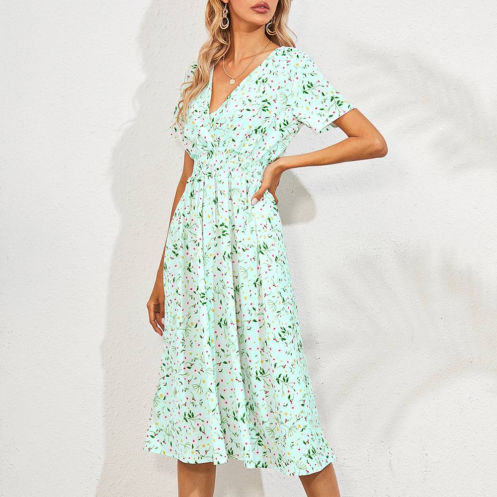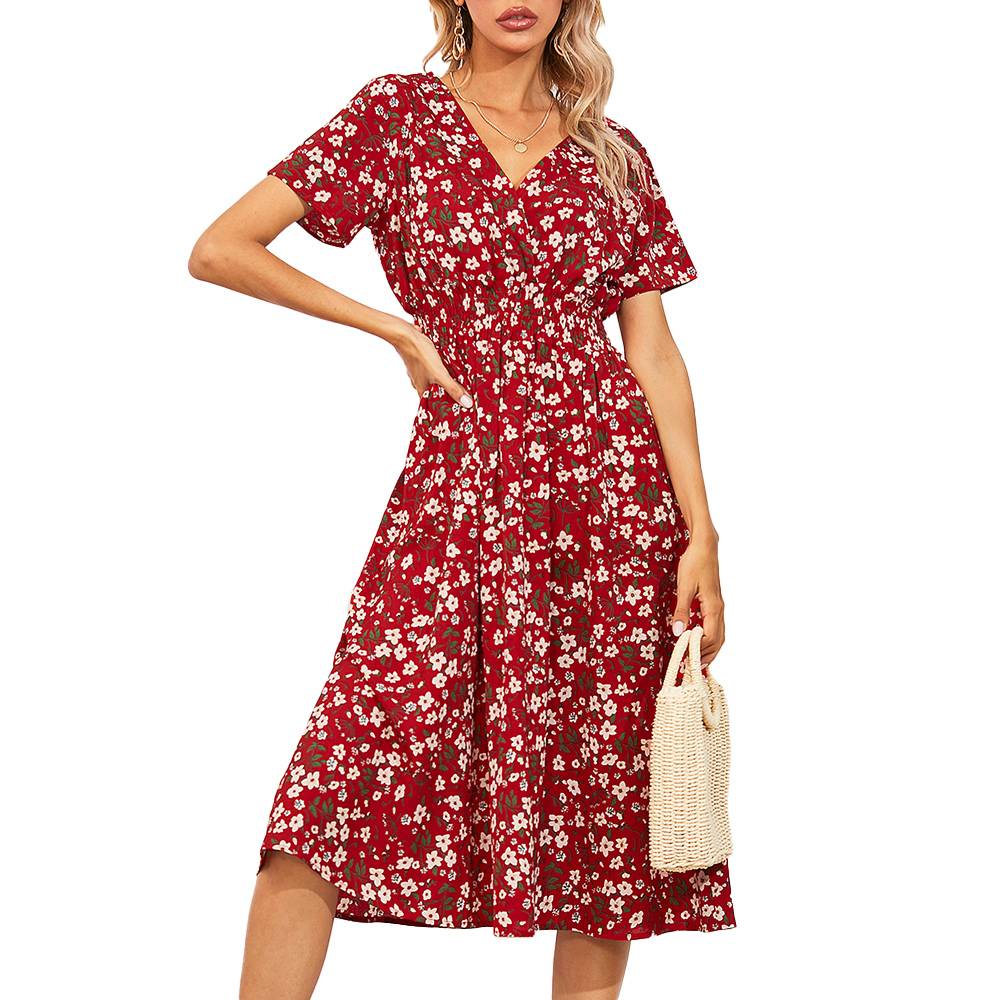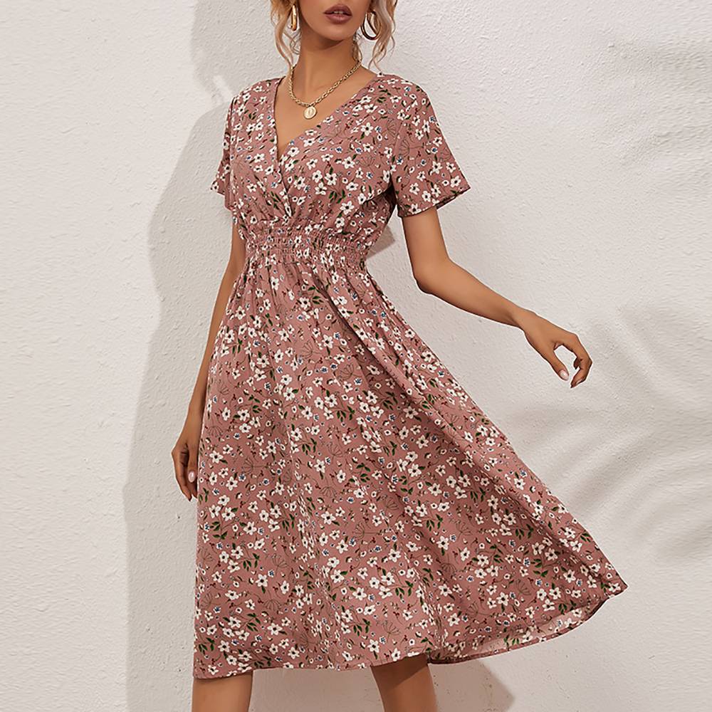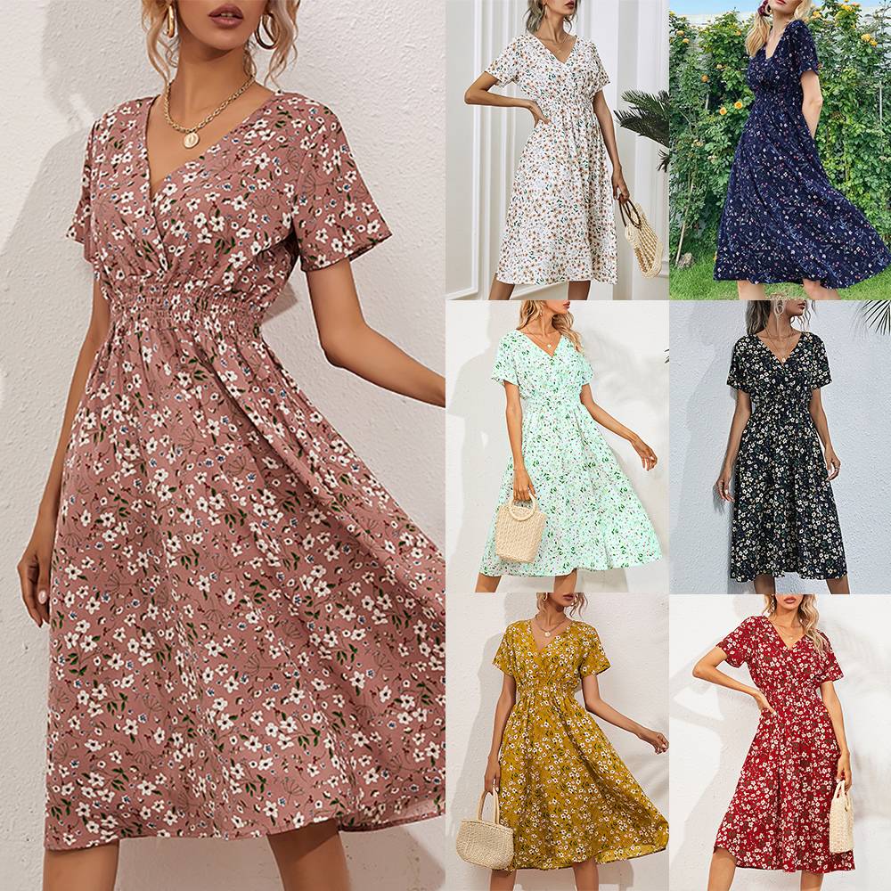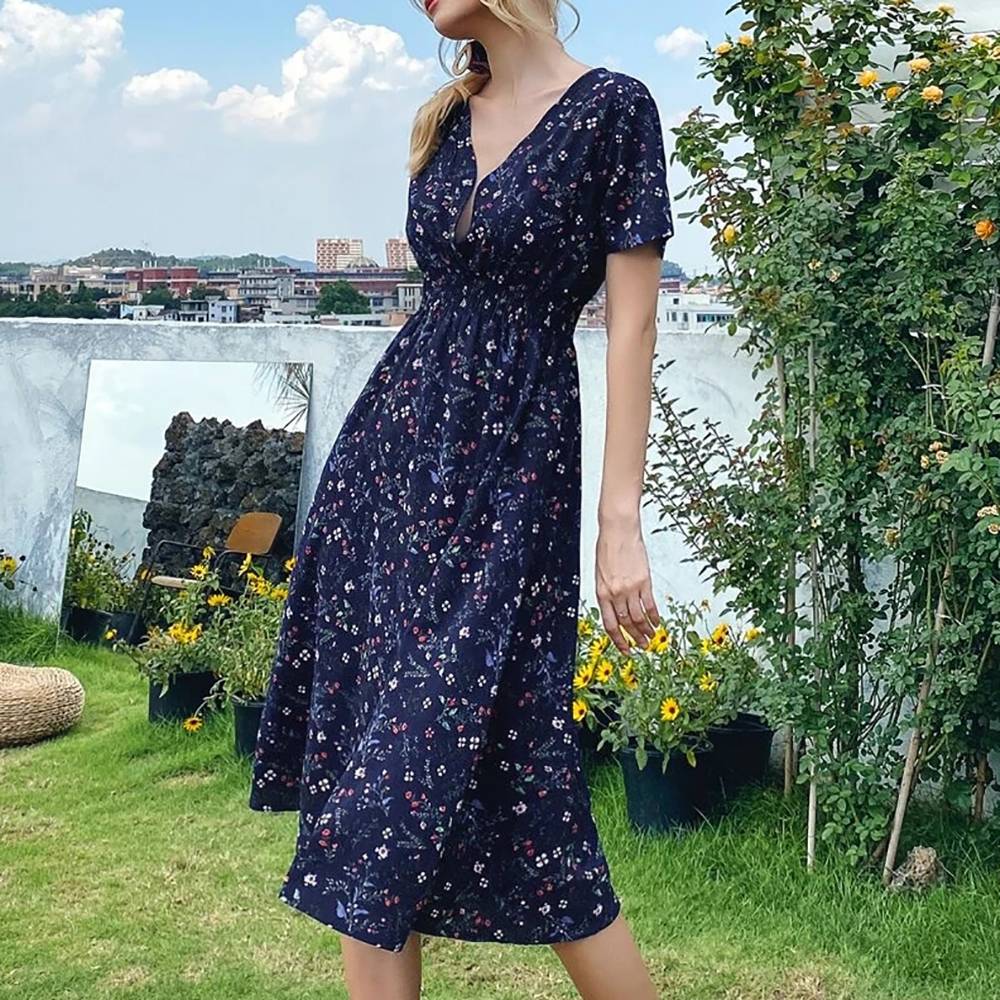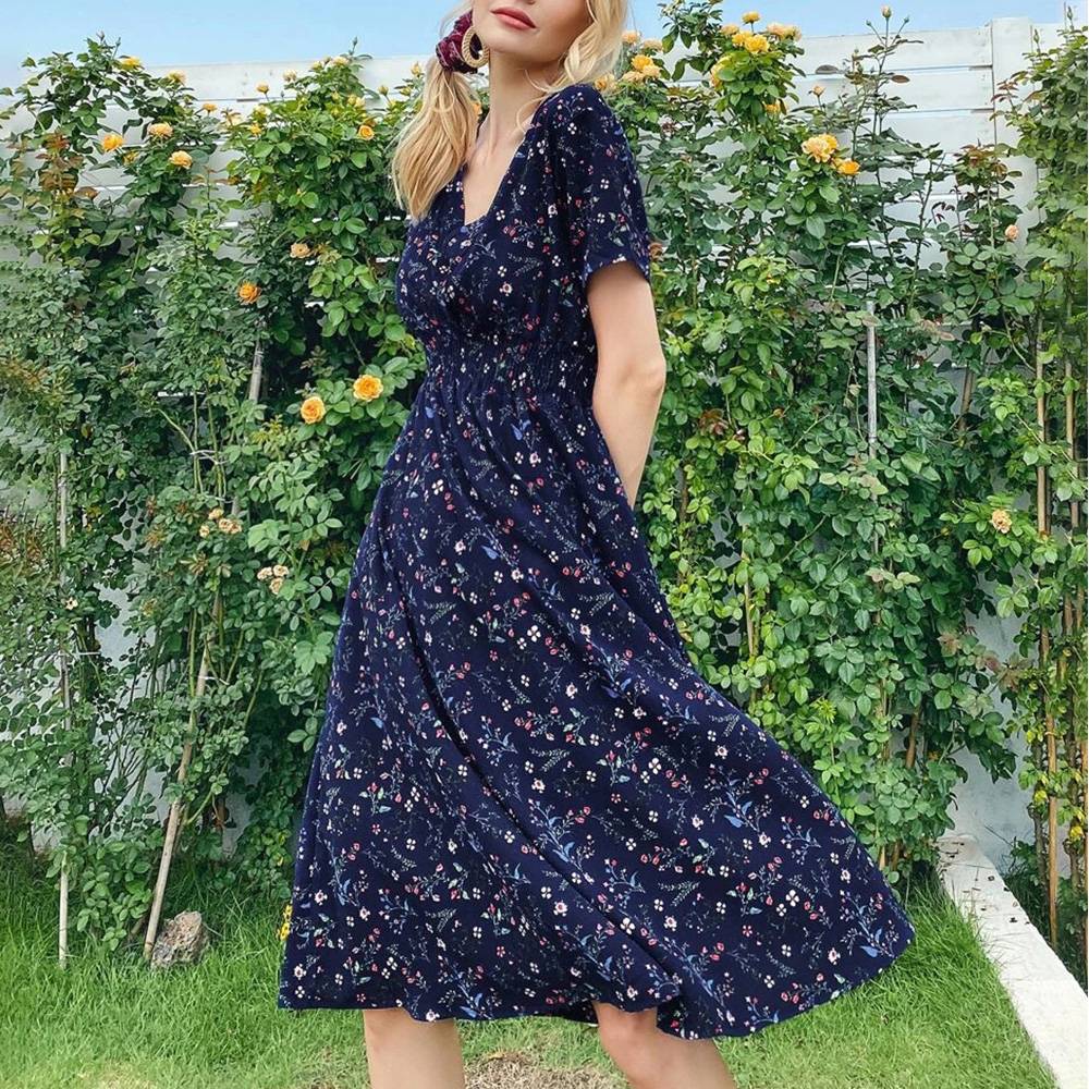 Женское платье миди в стиле бохо с цветочным принтом и V-образным вырезом, женский летний пляжный сарафан с короткими рукавами