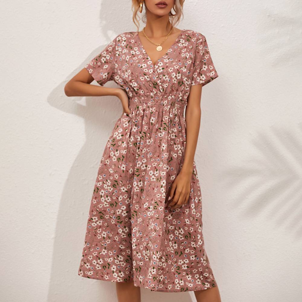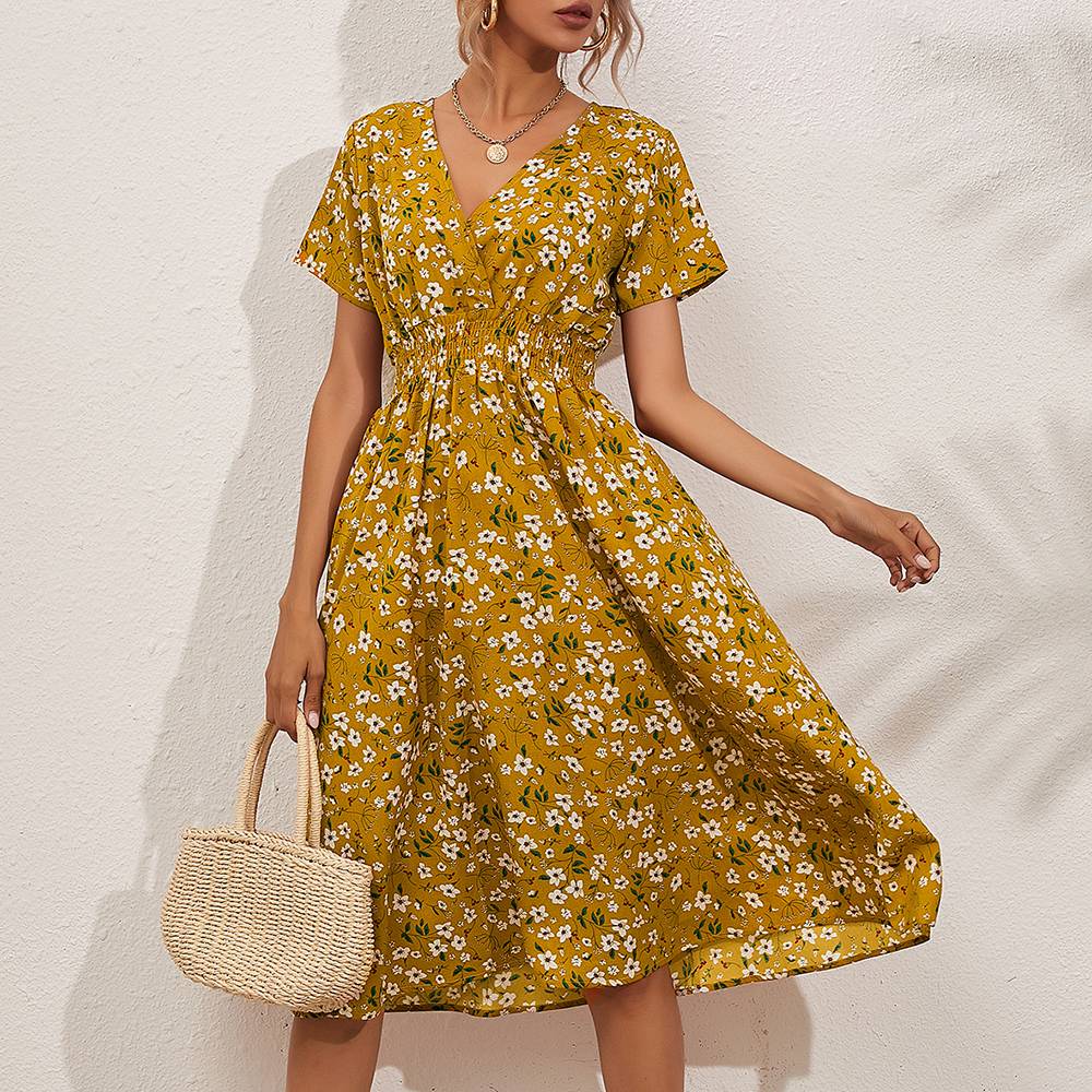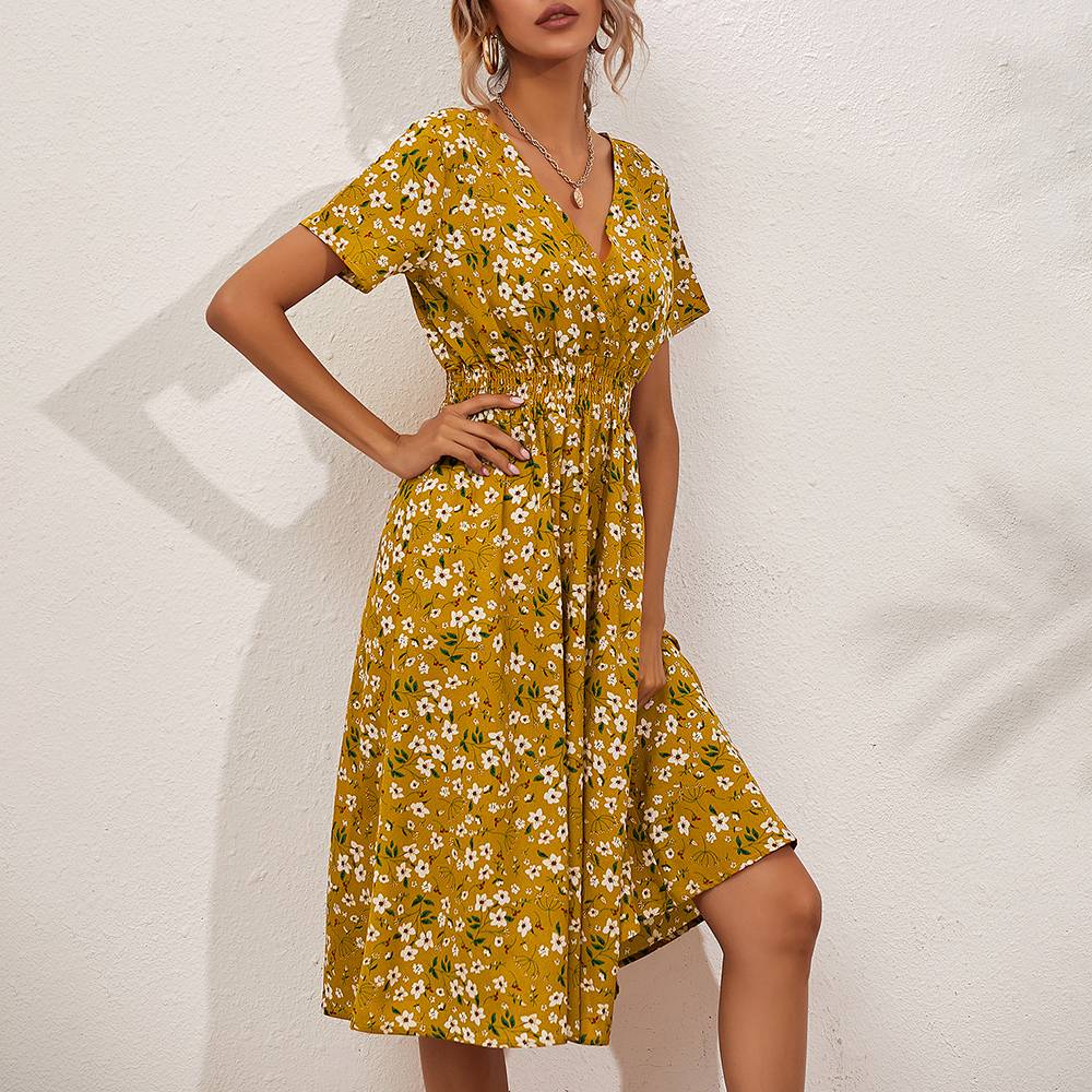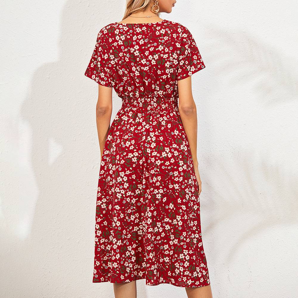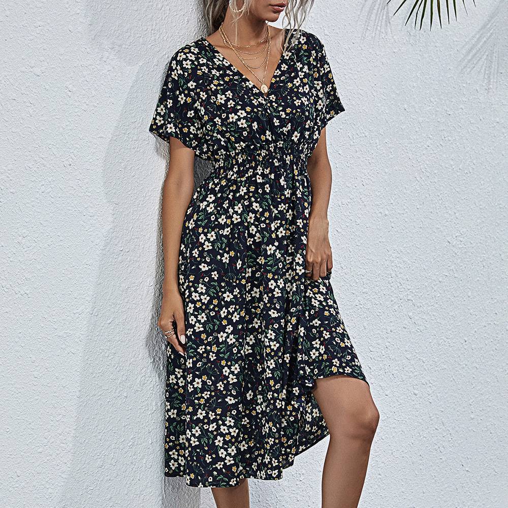 Женское платье миди в стиле бохо с цветочным принтом и V-образным вырезом, женский летний пляжный сарафан с короткими рукавами