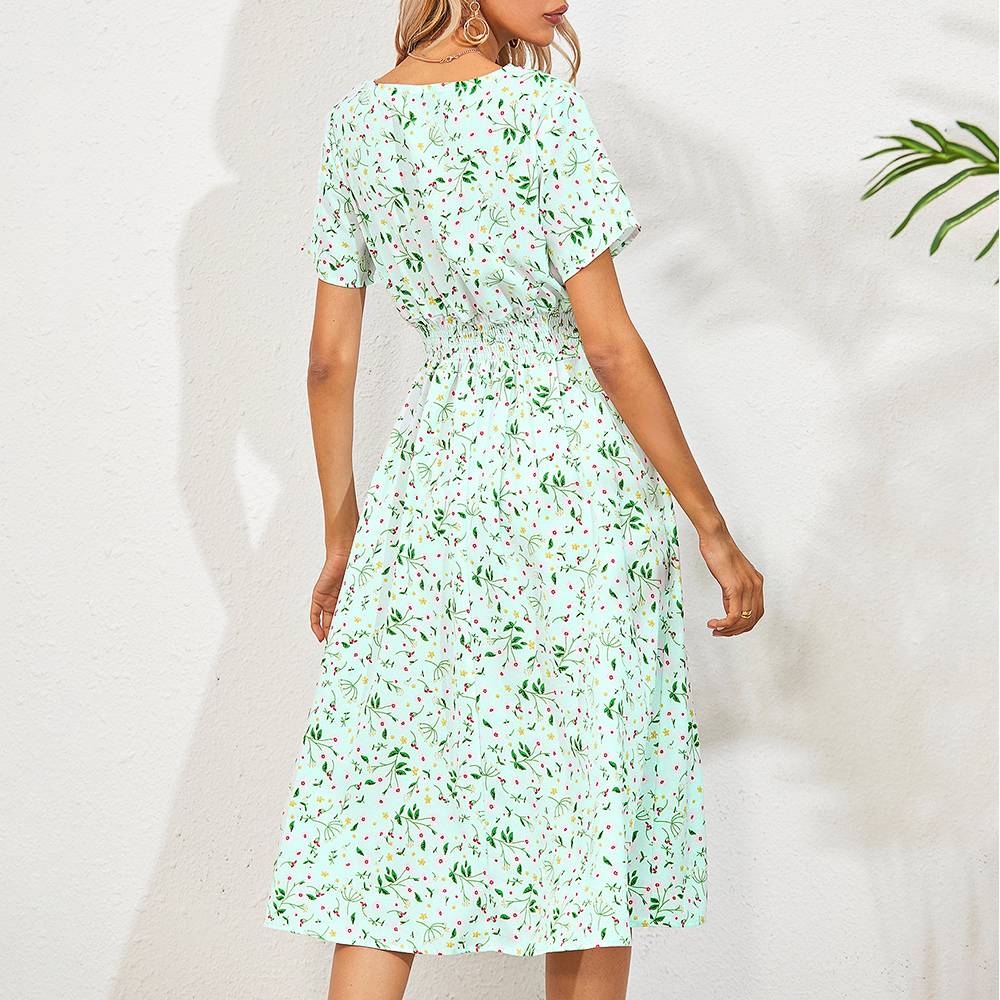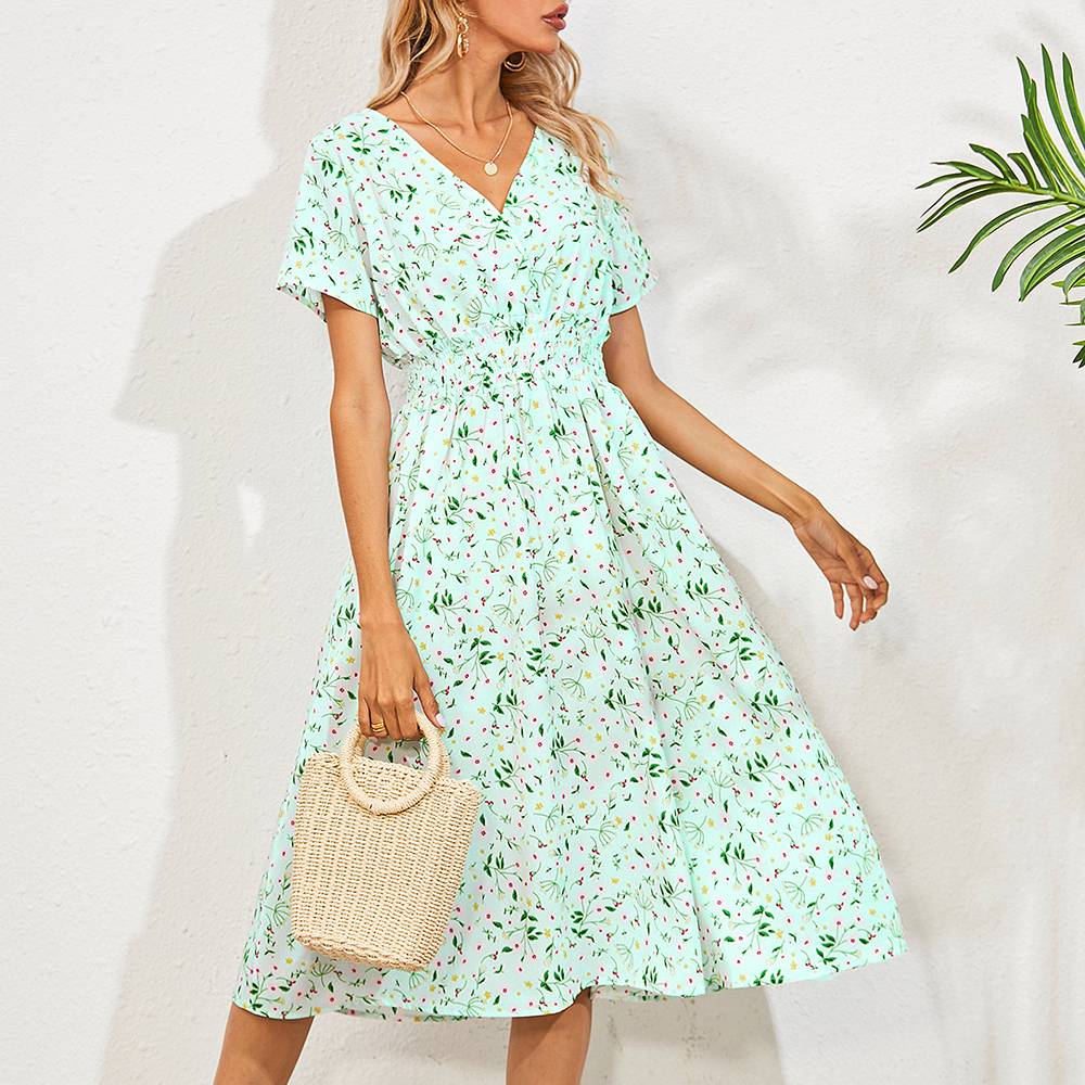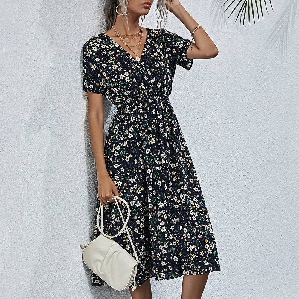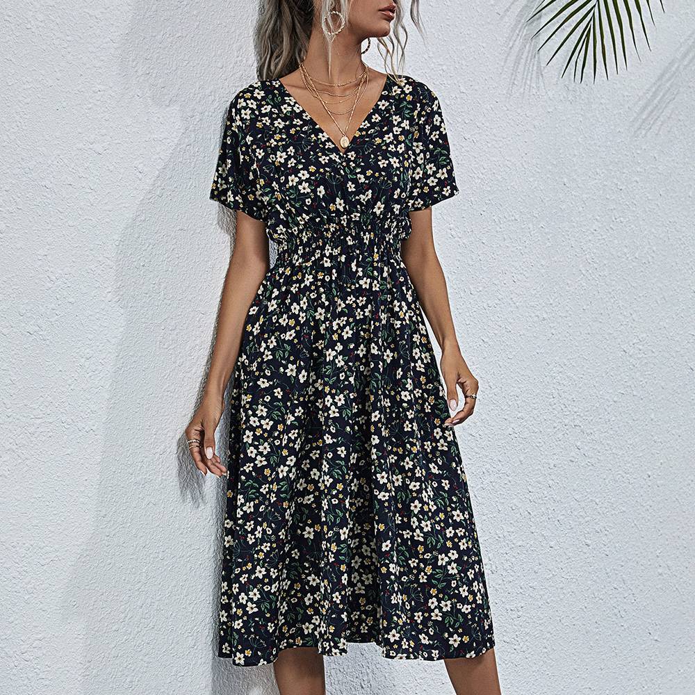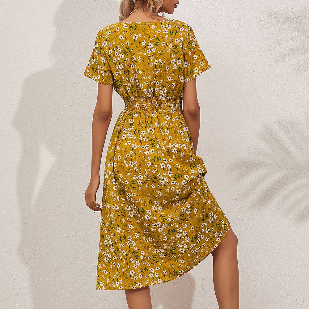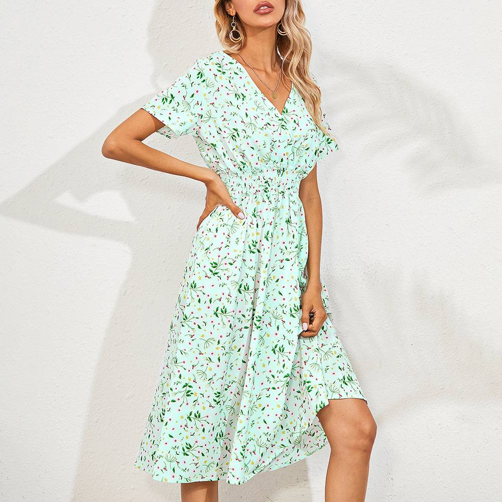Женское платье миди в стиле бохо с цветочным принтом и V-образным вырезом, женский летний пляжный сарафан с короткими рукавами
