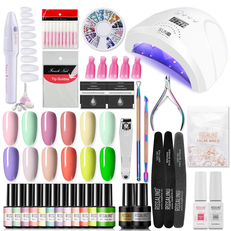 (Светодиодная / УФ-лампа для ногтей, зернистый файл, буфер песка, eco shiner. Средство для снятия треугольника, Вилка для кутикулы, Толкатель для кутикулы, Ножницы для кутикулы, Кусачка для ногтей, Подушечка для удаления*20, Смягчитель кутикулы, Масло для кутикулы, Клей для ногтей *10, Базовое покрытие, Верхнее покрытие, Направляющие наконечники *5, Голографический блеск для ногтей, Ложный гвоздь, Зажим воскресения *5, Украшение ногтей, Электрическая дрель для ногтей)