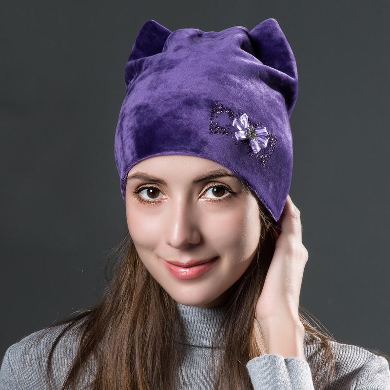 Женский зимний золотой бархатный пуловер с кошачьими ушками, теплая двухслойная вязаная шапка с милыми цветами и бриллиантами — купить товар онлайн с бесплатной доставкой по всему миру!