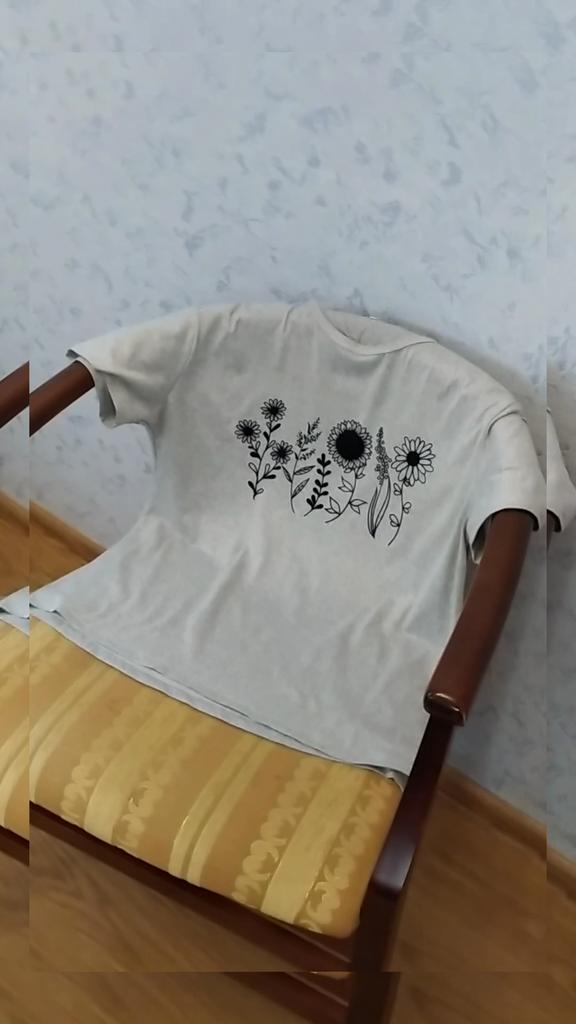 Серая футболка с цветами. У продавца большой выбор рисунков. Размеры S-4XL На мне размер 4XL Мои параметры: рост 162, 103-92-102 Футболка села по фигуре. Принт нанесён краской. Пошив аккуратный. Ткань смесовая, хлопок+полиэстер, по ощущениям полиэстер преобладает. Замеры: ОГ-112 Ширина плеч-48 Длина-64 Длина рукава-18 Рекомендовать могу.