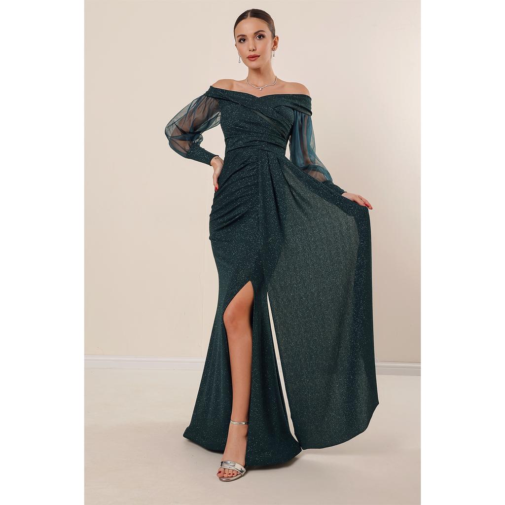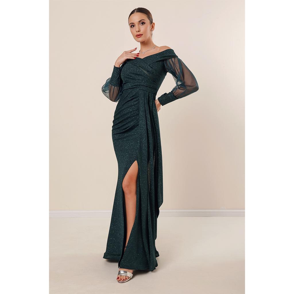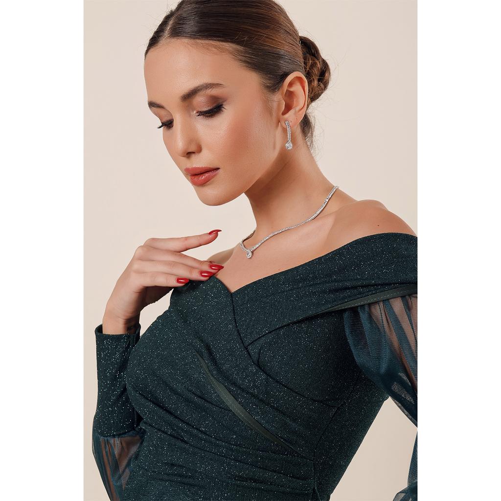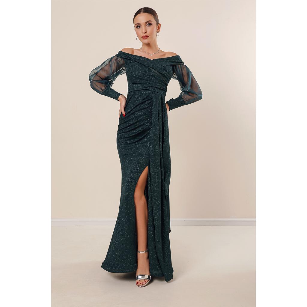 Блестящее длинное платье из лайкры и плиссированной ткани Madonna с воротником и рукавами на подкладке из тюля спереди