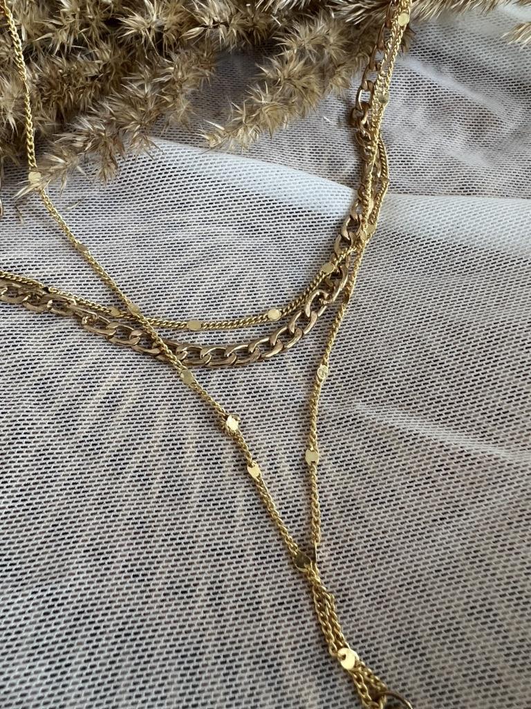 Многослойное ожерелье из нержавеющей стали. Красиво смотрится на шеи и не перегружает своей простотой. Украшение легкое и невесомое. Цепочки тоненькие, но прочные. Украшение приходит в коробке. Приходит с комплиментами в виде магнитика из Турции и браслета от сглаза. Имеется небольшой запах металла при ручном контакте. В нОске запах не ощущается, аллергии не вызвало. Подойдет в качестве украшений на каждый день с блузками, водолазками и т.д Цена для такого украшения уж очень завышена. В остальном украшение прелестное и милое. 🙂